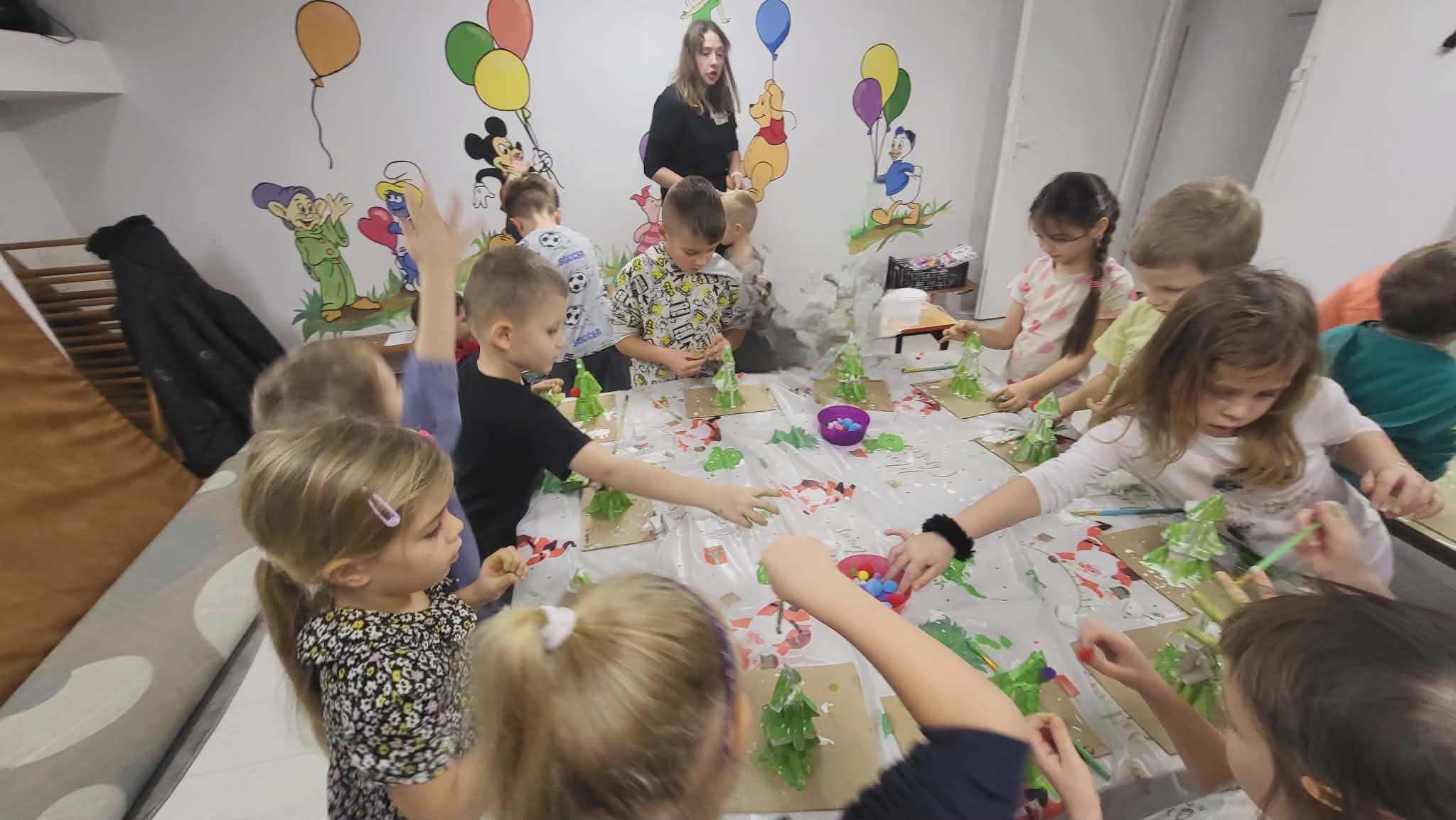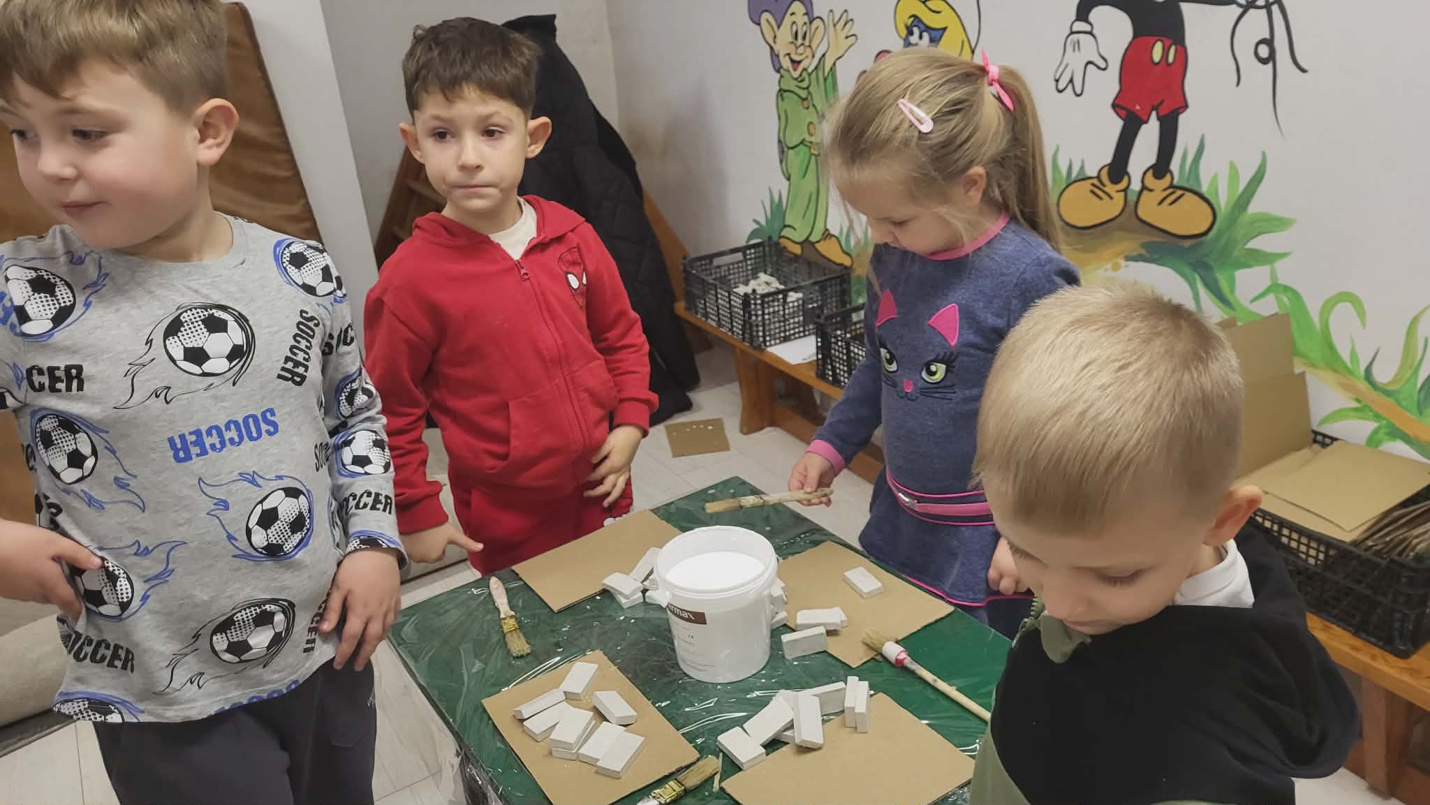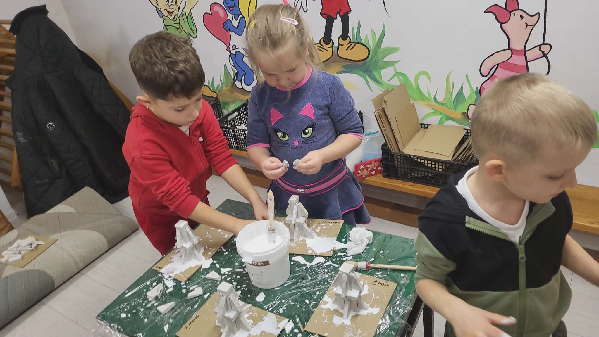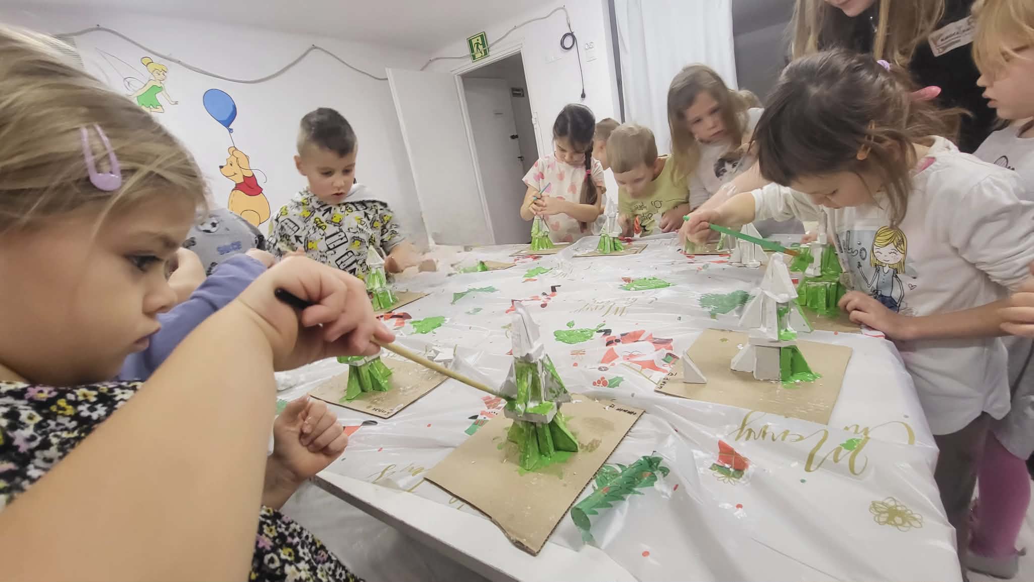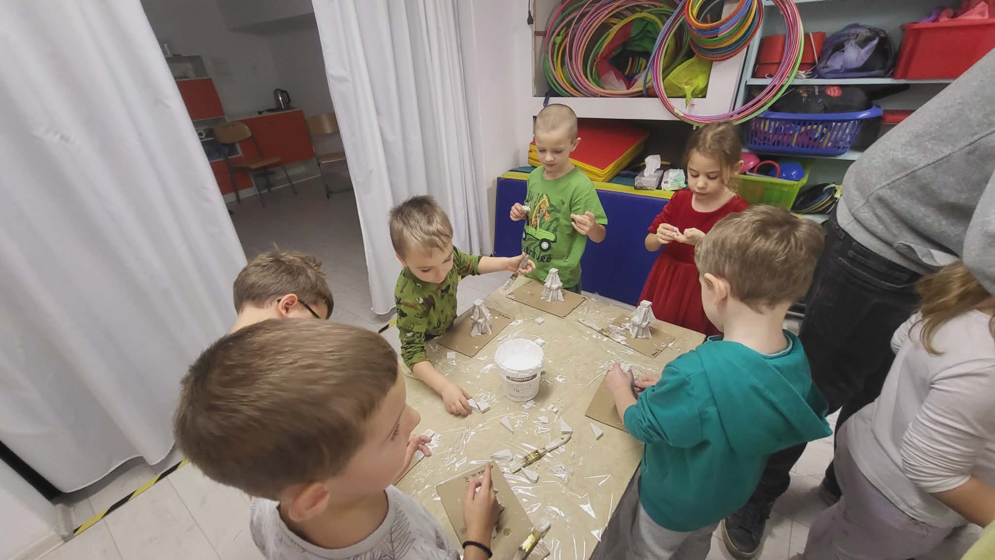 W ramach świątecznej niespodzianki dla Dzieci Rada Rodziców postanowiła sfinansować warsztaty z majsterkowania. Dzieci przygotowywały murowane choinki . Podczas zajęć zamieniły się w małych budowniczych i za pomocą prawdziwych miniaturowych cegiełek, kleju i zaprawy murarskiej stworzyły swoje dzieła.