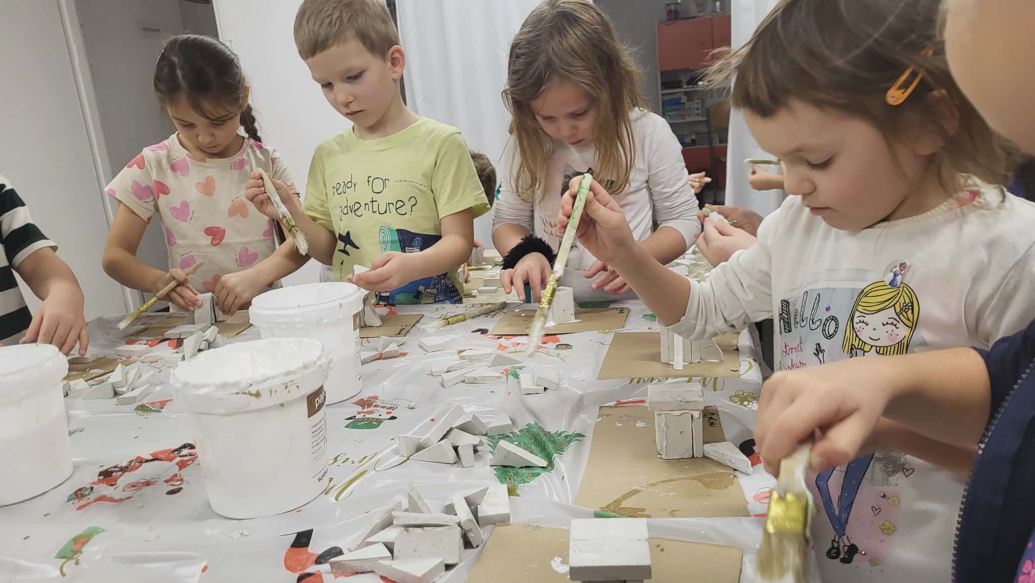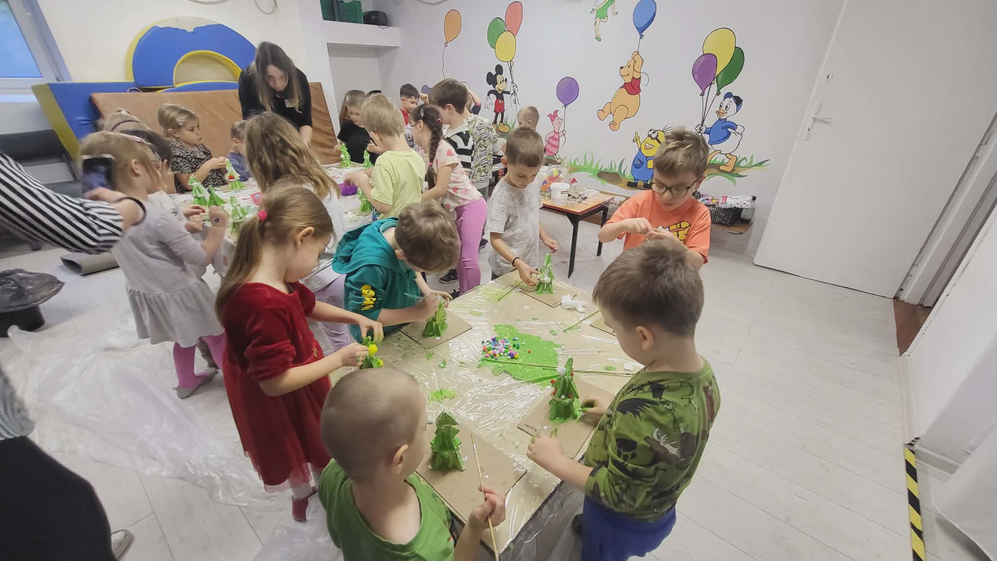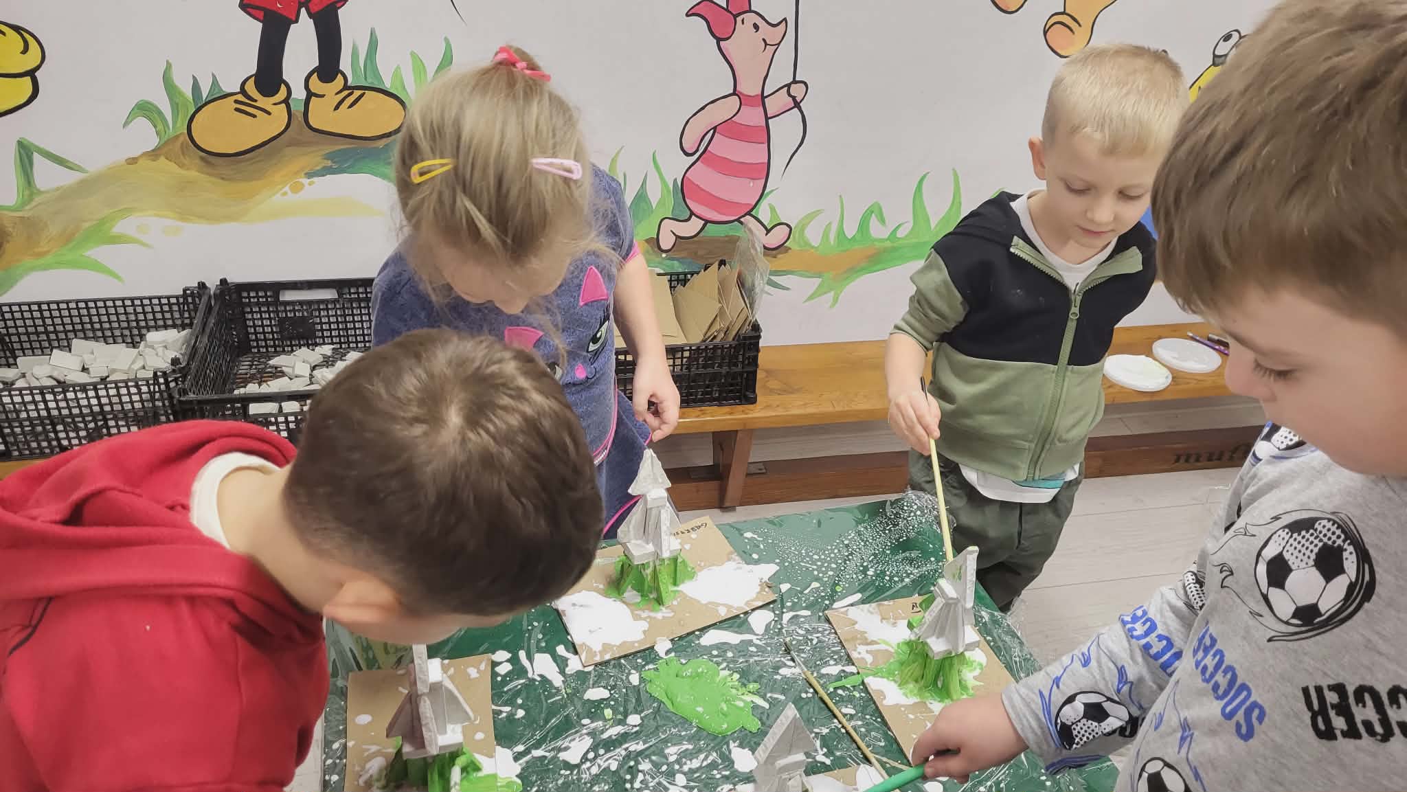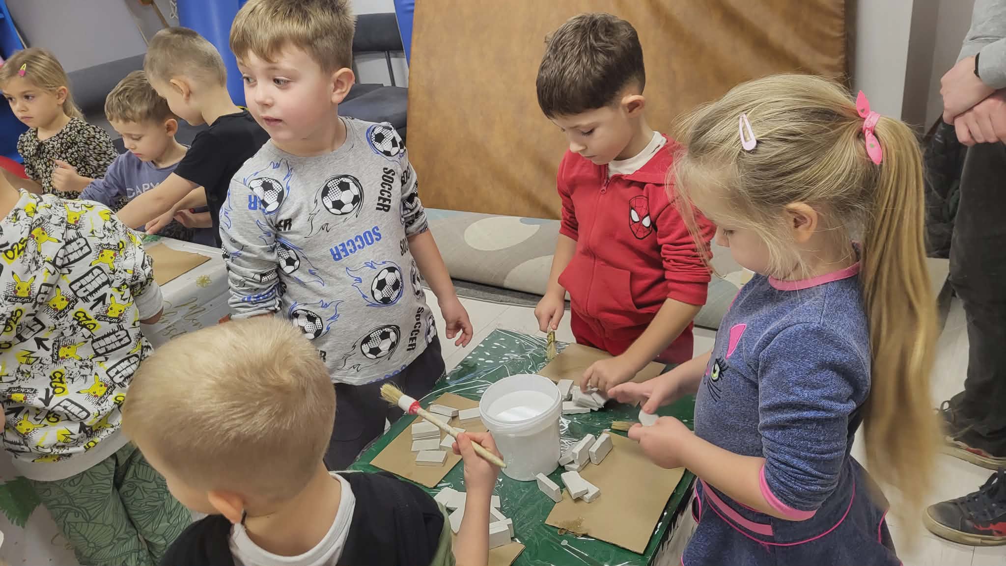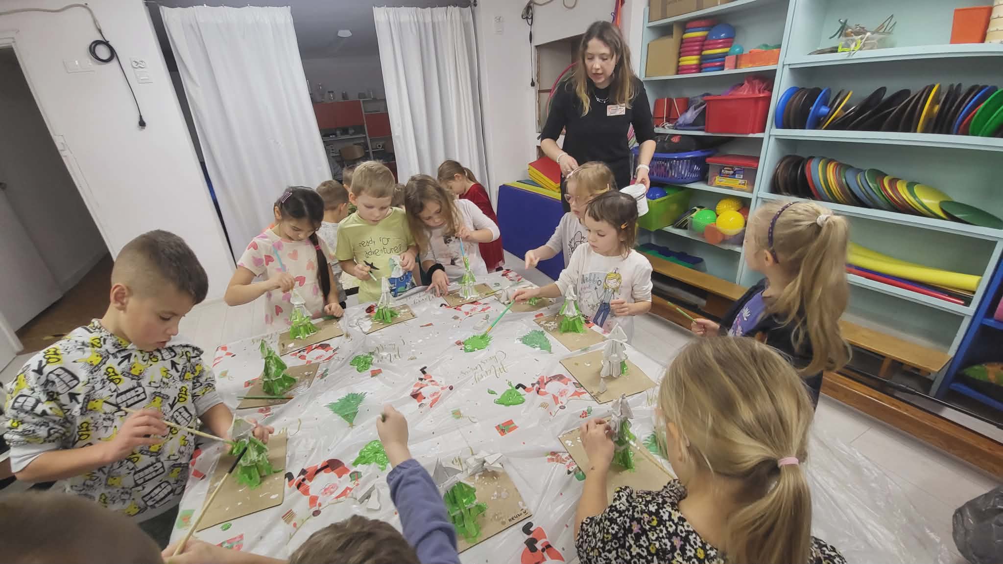 W ramach świątecznej niespodzianki dla Dzieci Rada Rodziców postanowiła sfinansować warsztaty z majsterkowania. Dzieci przygotowywały murowane choinki . Podczas zajęć zamieniły się w małych budowniczych i za pomocą prawdziwych miniaturowych cegiełek, kleju i zaprawy murarskiej stworzyły swoje dzieła.