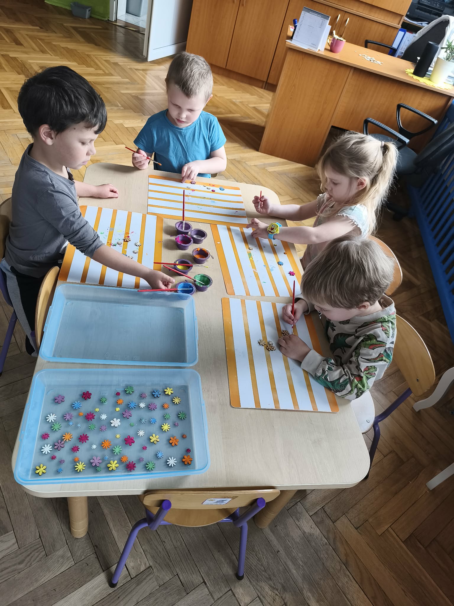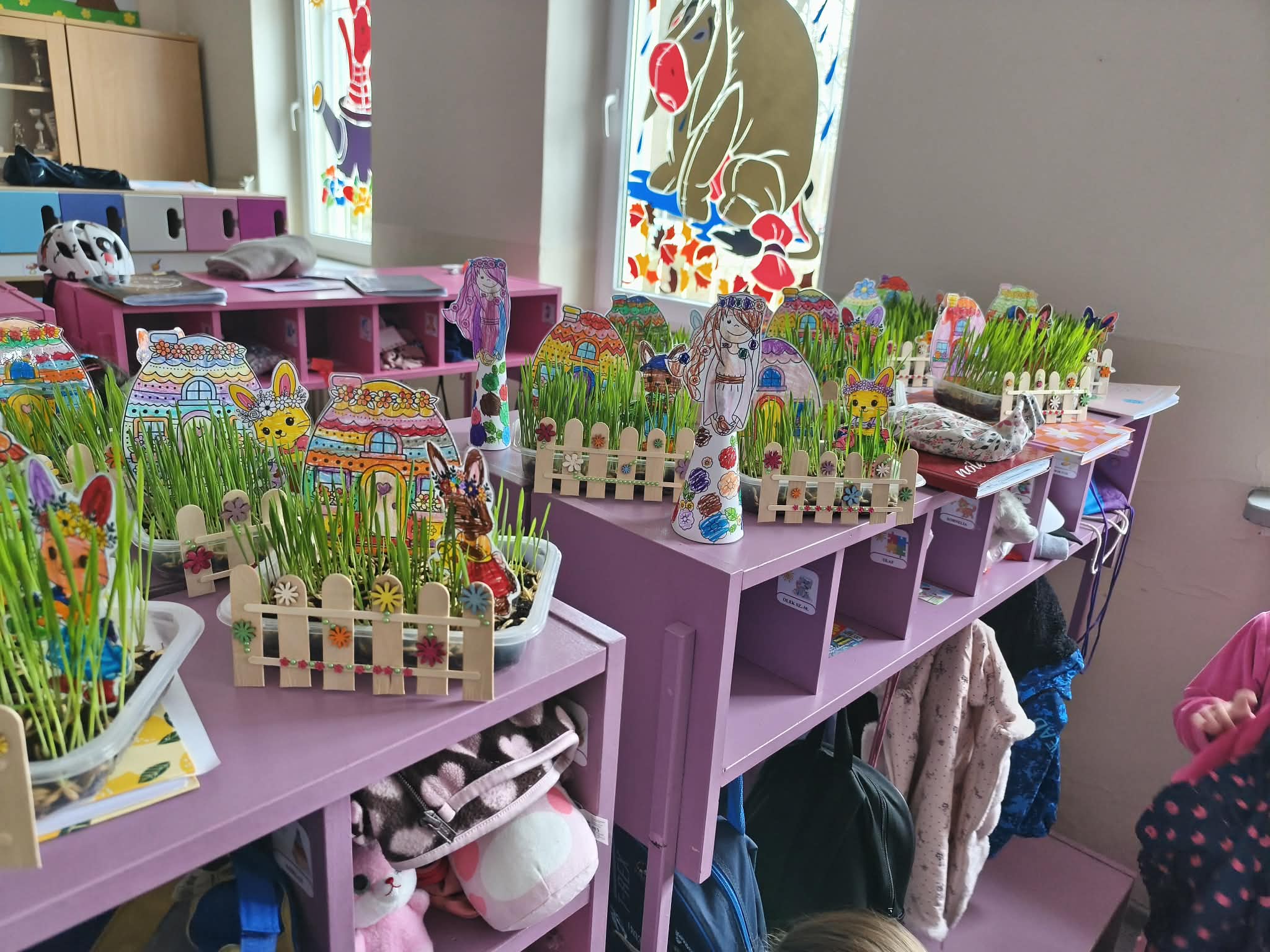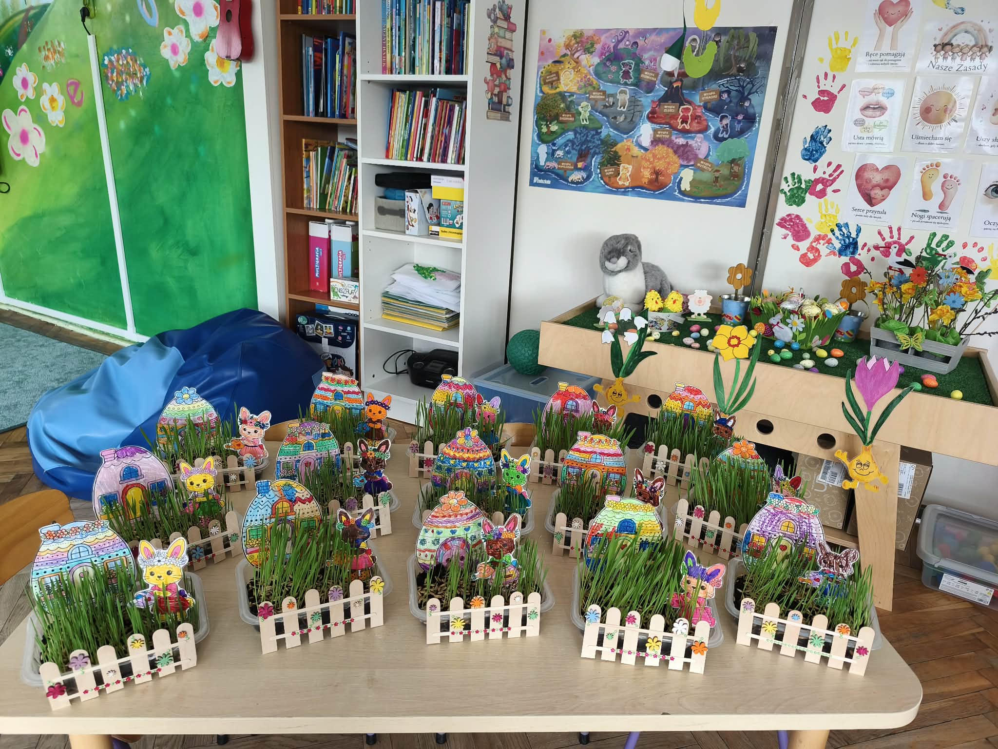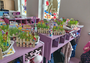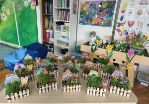 Wiosna, wiosna, wiosna... Nasze ogródeczki gotowe. Praca była wieloetapowa. Sianie owsa, malowanie domków, króliczków, malowanie i naklejanie kwiatków i codzienne podlewanie. Nieodzowna okazała się pomoc nasze pani, która łączyła wszystkie elementy klejem na gorąco. Kolorowe, piękne i wiosenne zabraliśmy do domów, aby mogły cieszyć nie tylko nasze oczy.