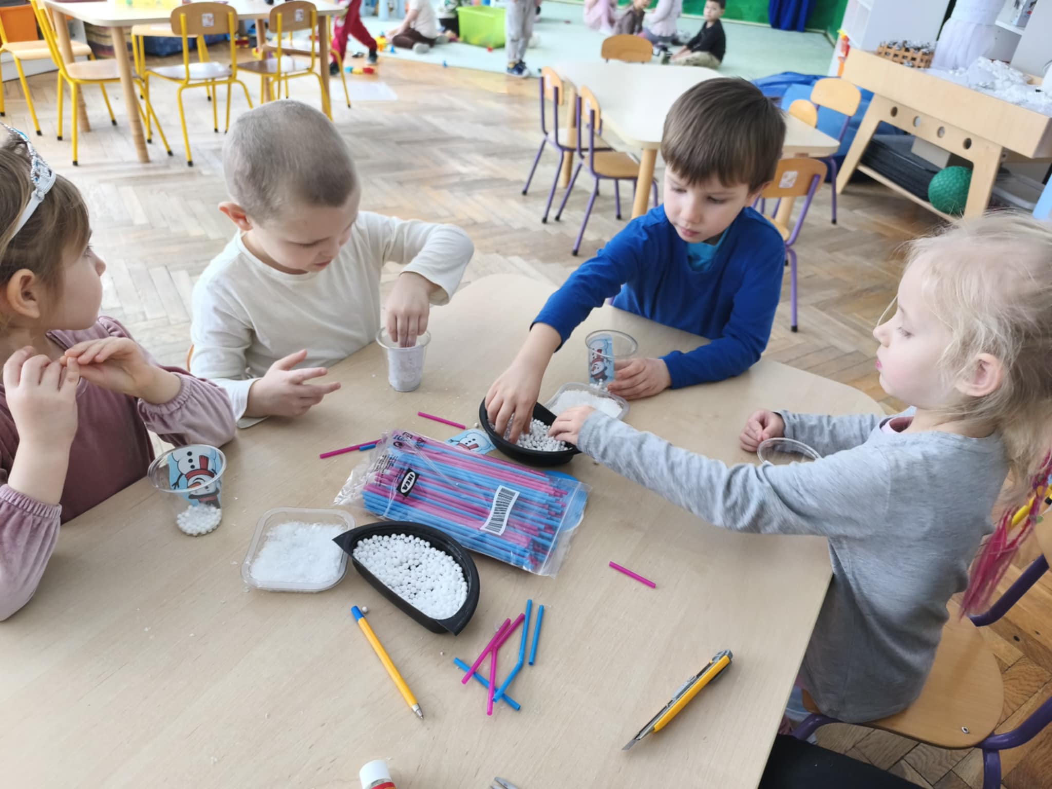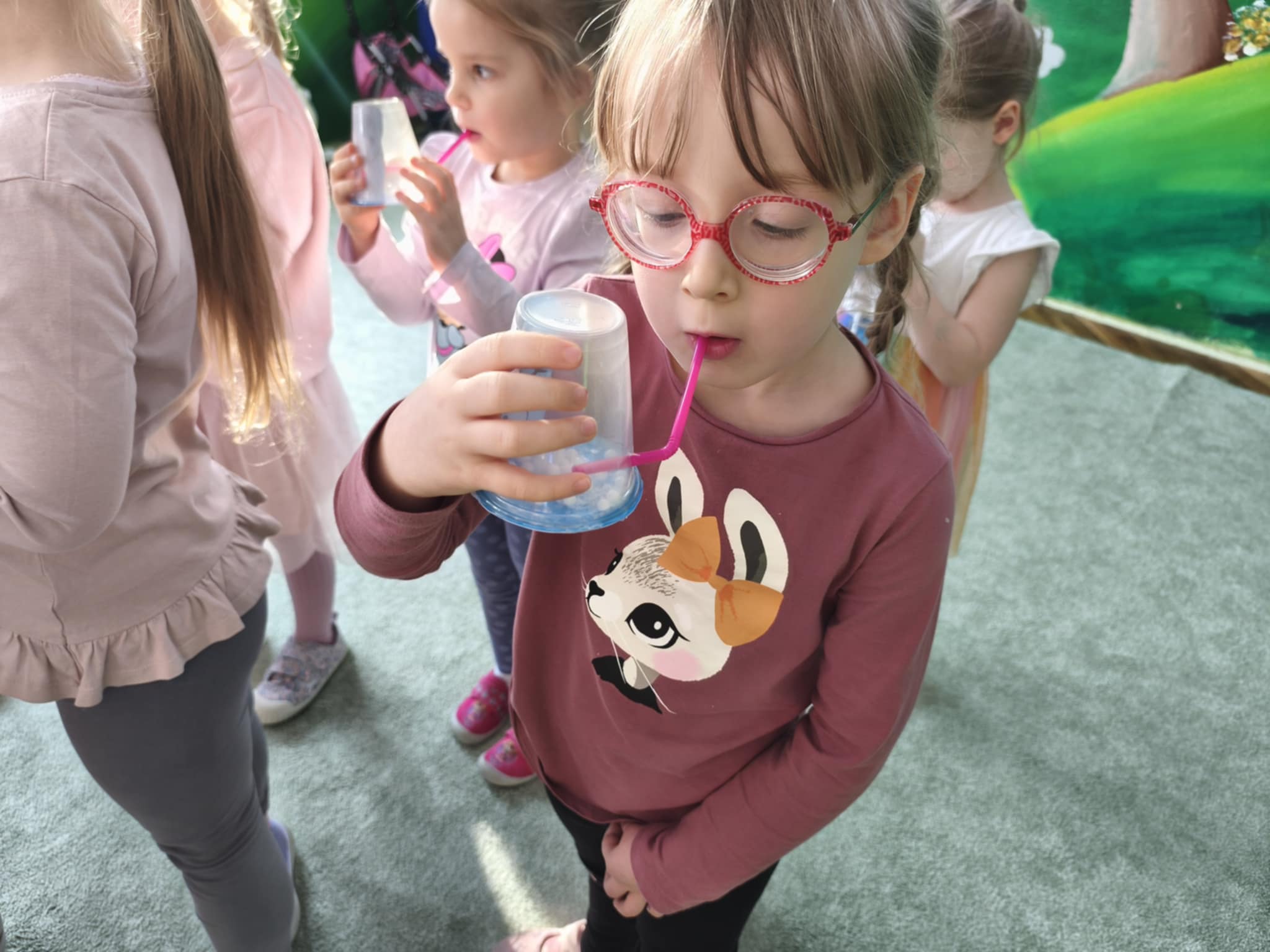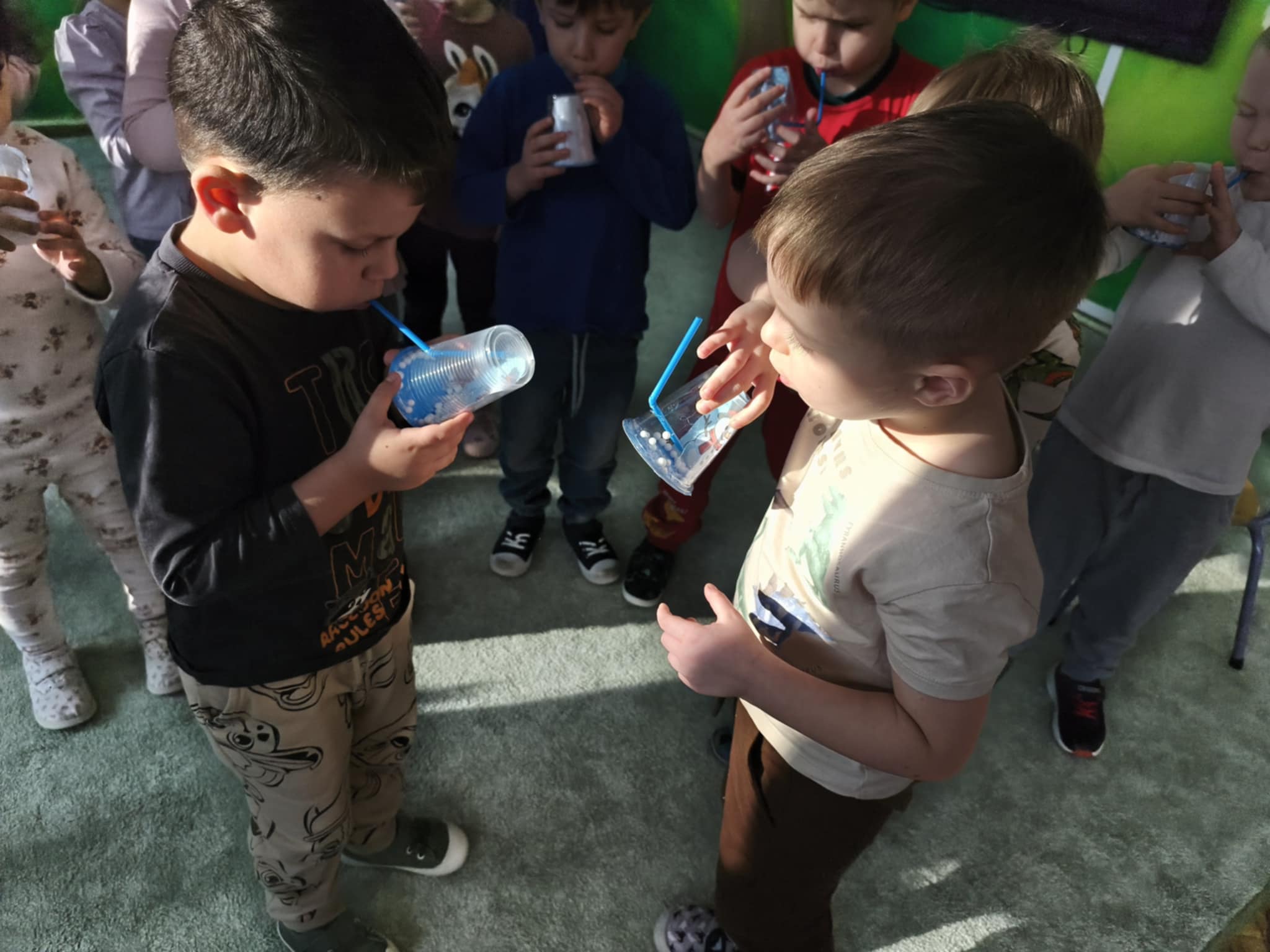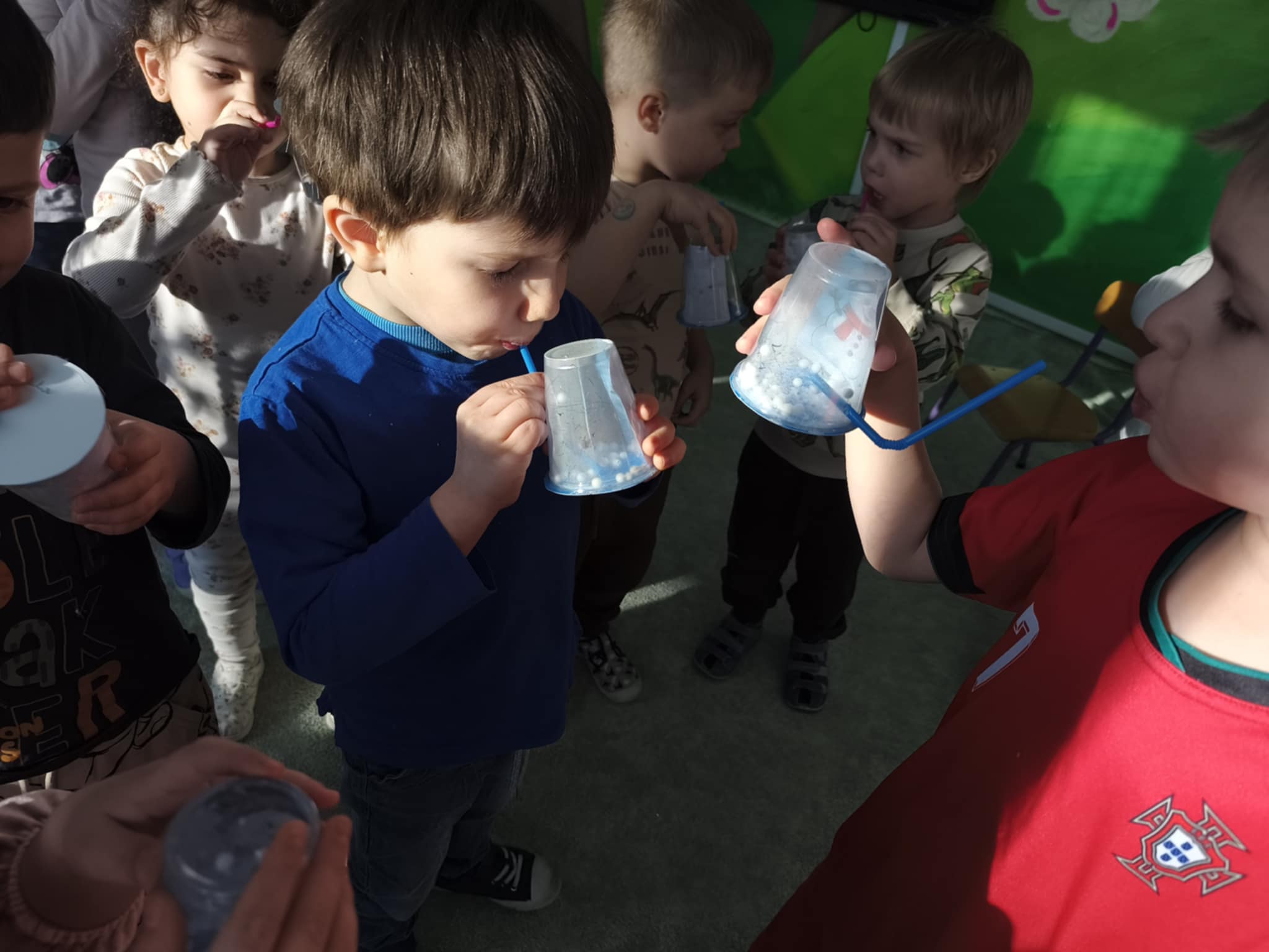 Ćwiczenia oddechowe pomagają nam wzmacniać aparat artykulacyjny i towarzyszą nam każdego dnia. Żeby je uatrakcyjnić, zrobiliśmy dzisiaj śnieżną pogodę w kubku. Abyśmy mogli zobaczyć wirujący "śnieg", musieliśmy mocno dmuchać przez słomkę, wprowadzając w ruch styropianowe kuleczki.