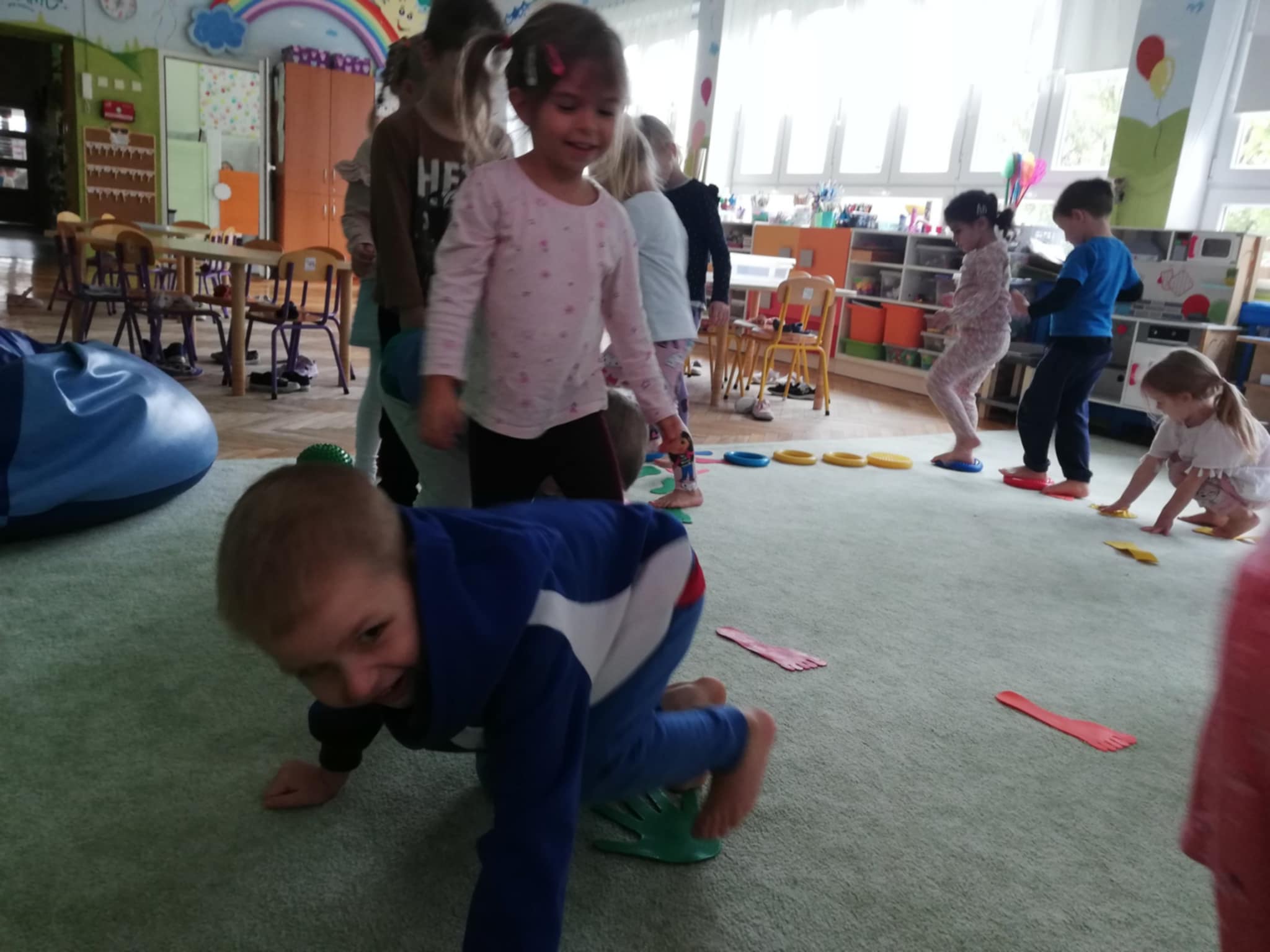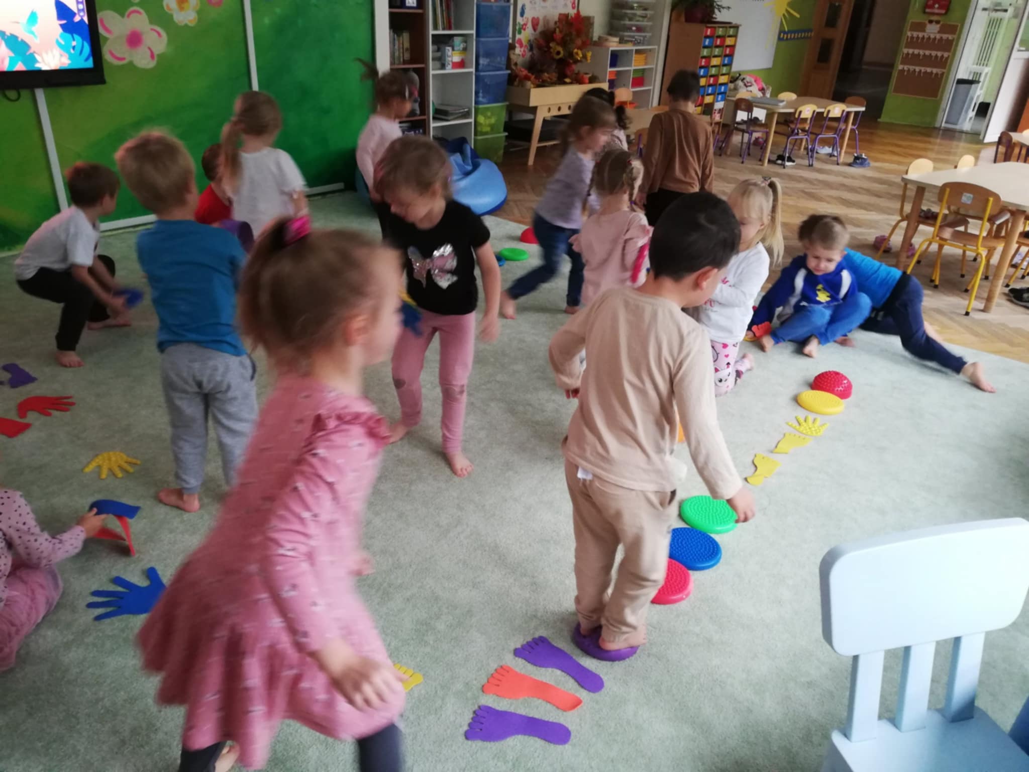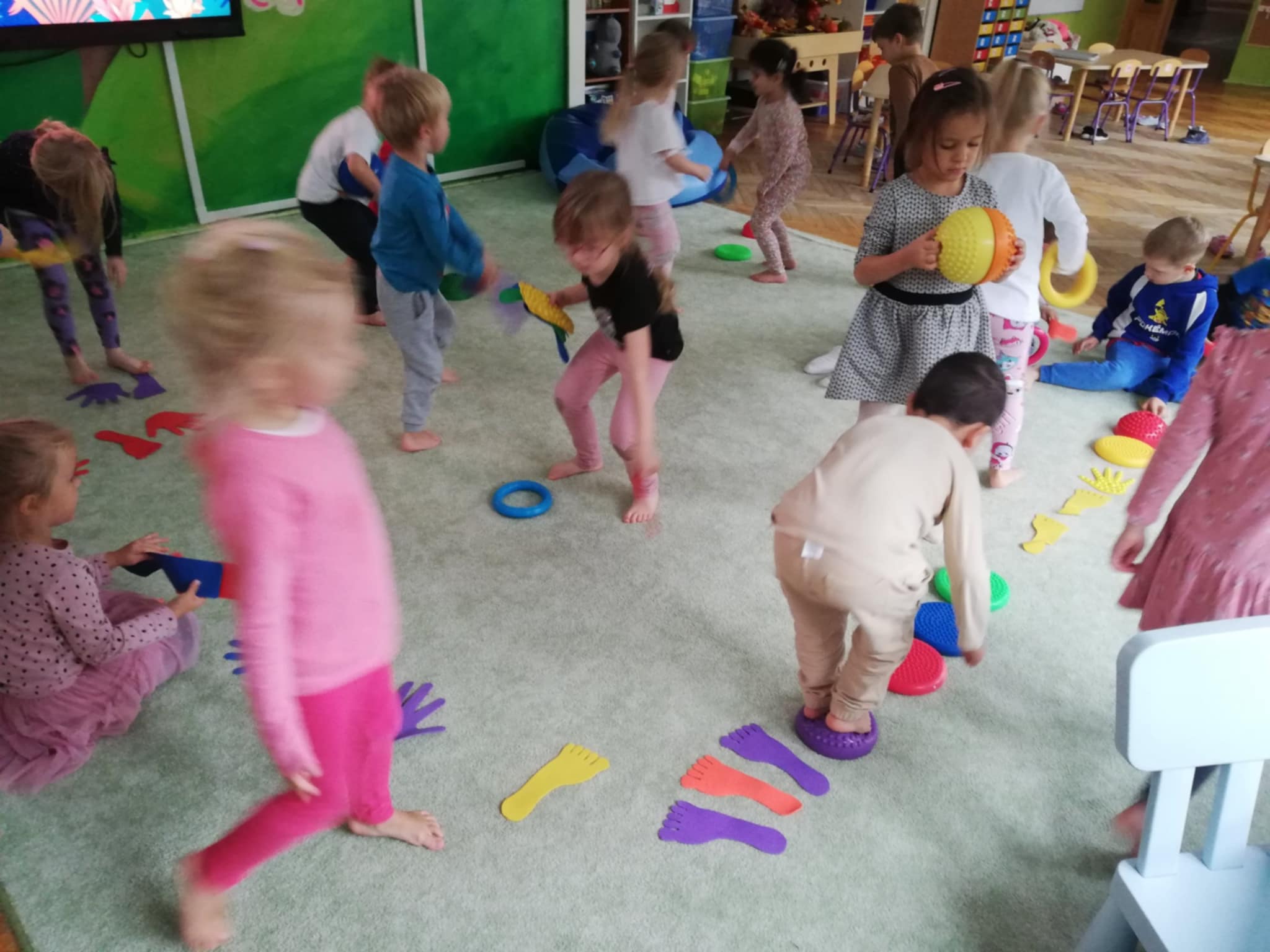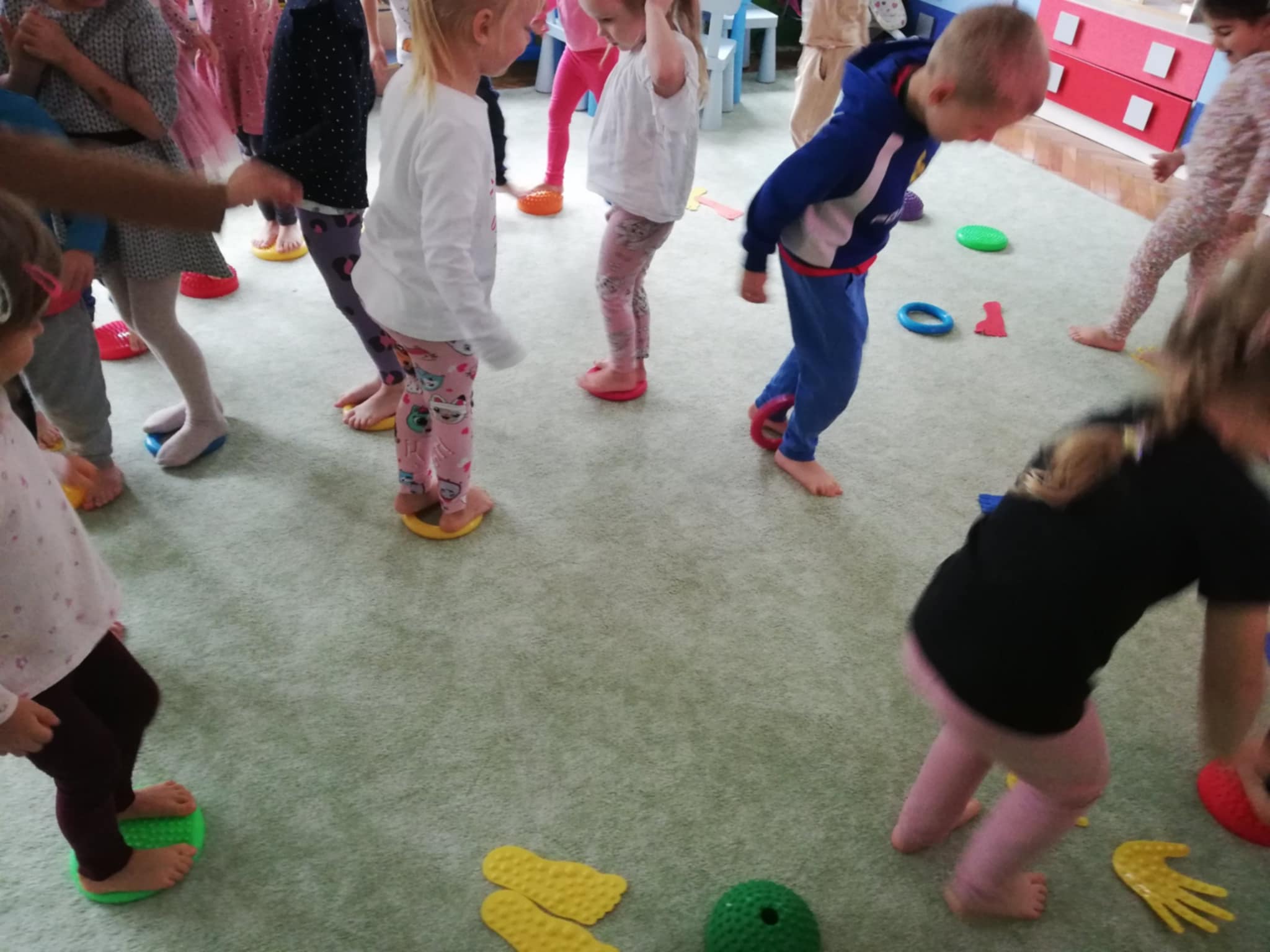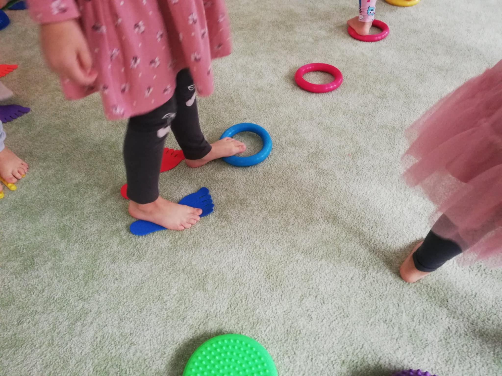 Dzisiaj doświadczaliśmy bosymi stopami. Spacer po krążkach i jeżykach, stópkach i łapkach to jedna z aktywności, która angażowała nasz zmysł dotyku. Przy okazji mieliśmy okazję sprawdzić, kto musi jeszcze poćwiczyć samodzielne zakładanie skarpet.