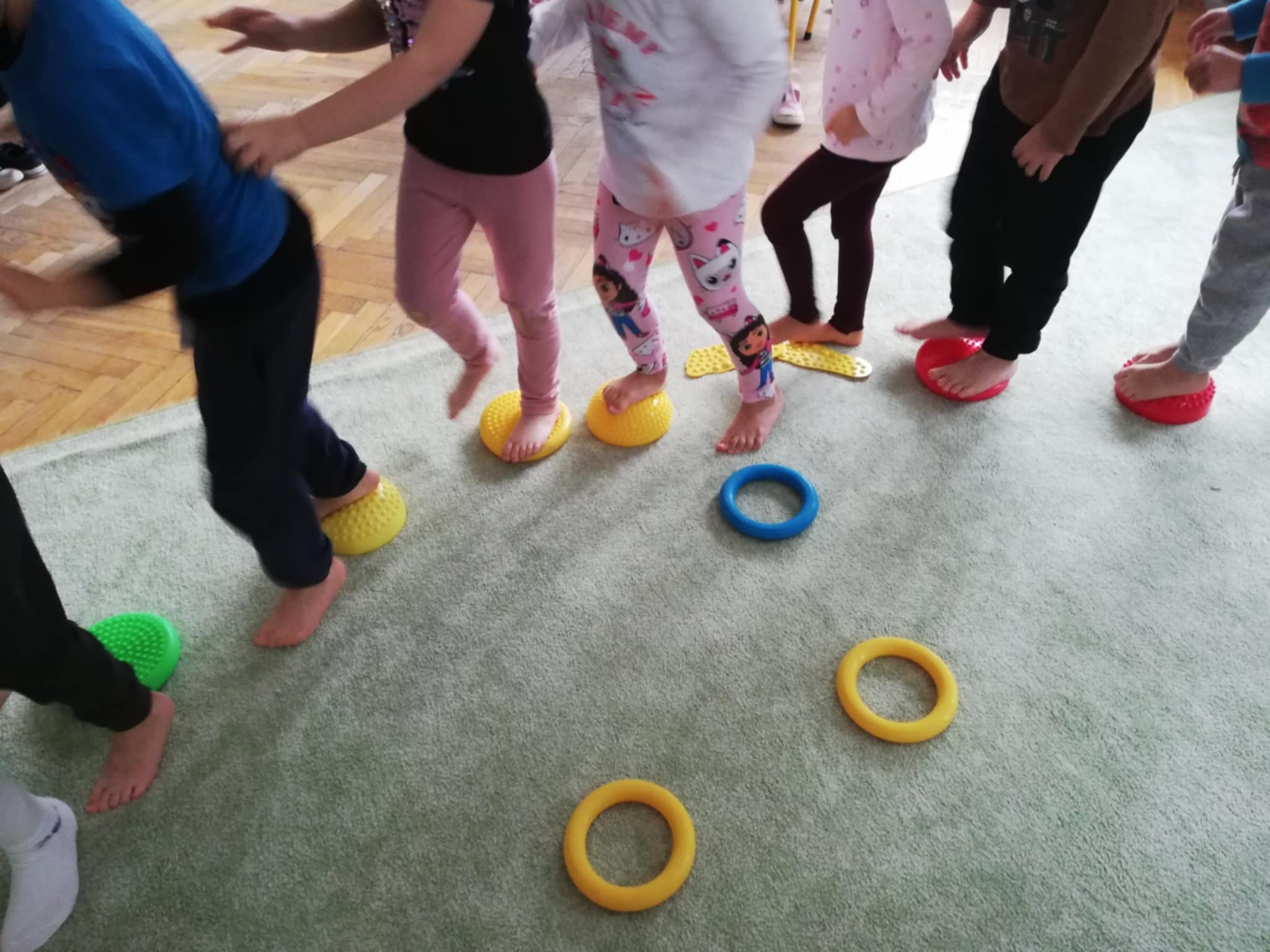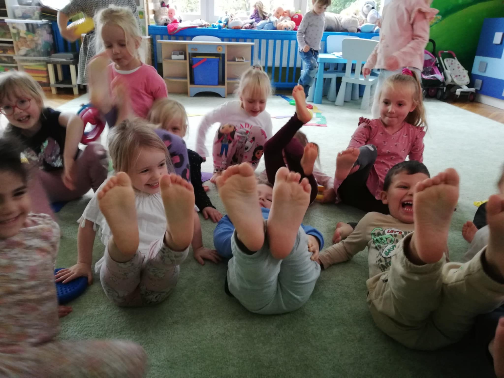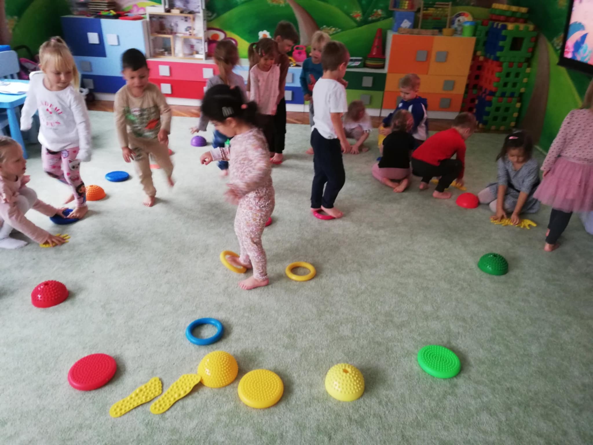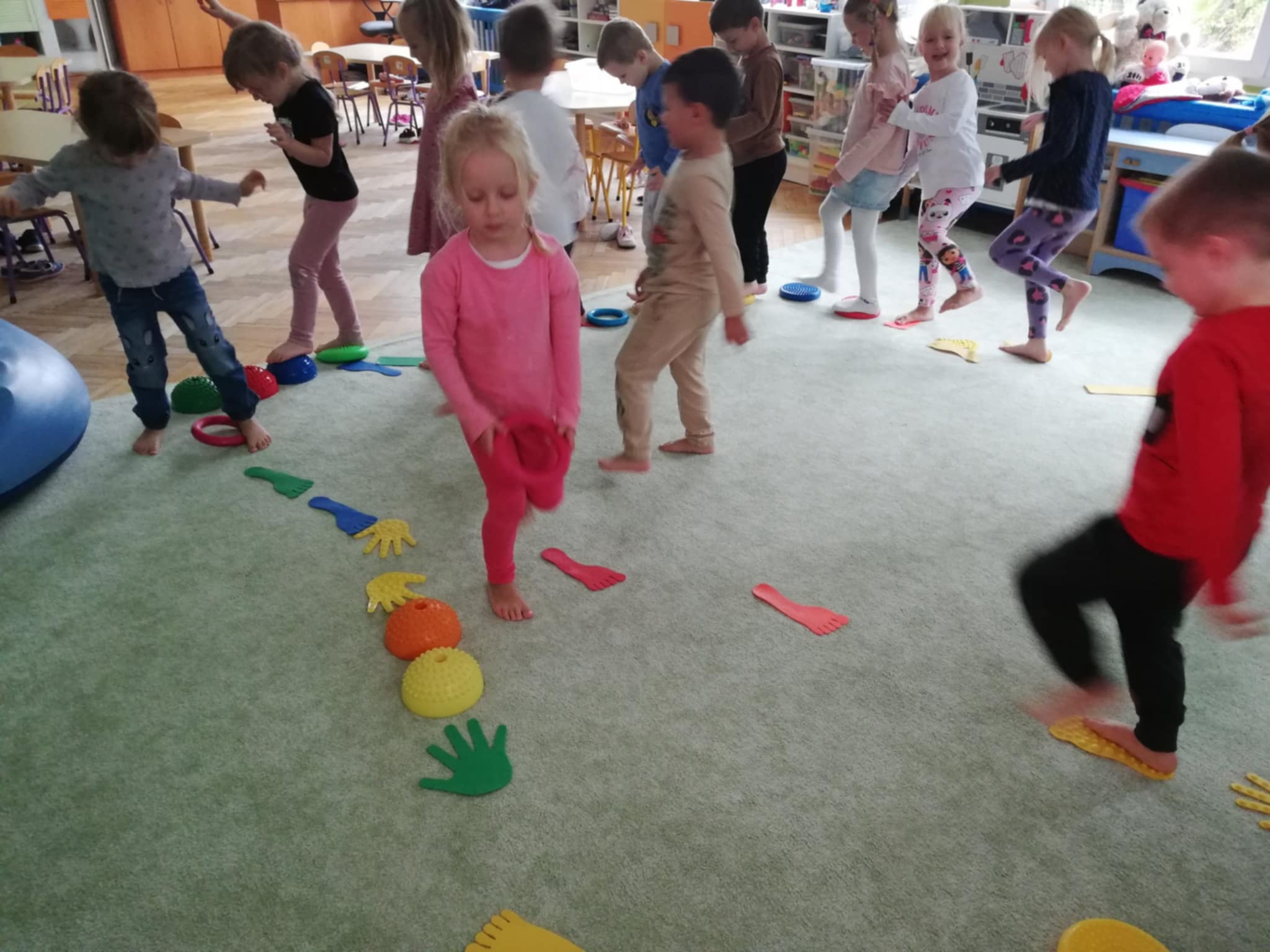 Dzisiaj doświadczaliśmy bosymi stopami. Spacer po krążkach i jeżykach, stópkach i łapkach to jedna z aktywności, która angażowała nasz zmysł dotyku. Przy okazji mieliśmy okazję sprawdzić, kto musi jeszcze poćwiczyć samodzielne zakładanie skarpet.