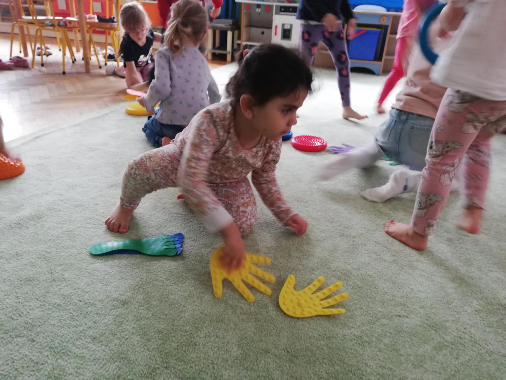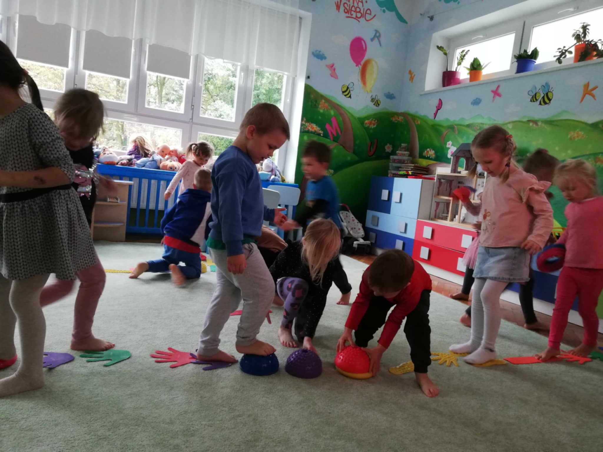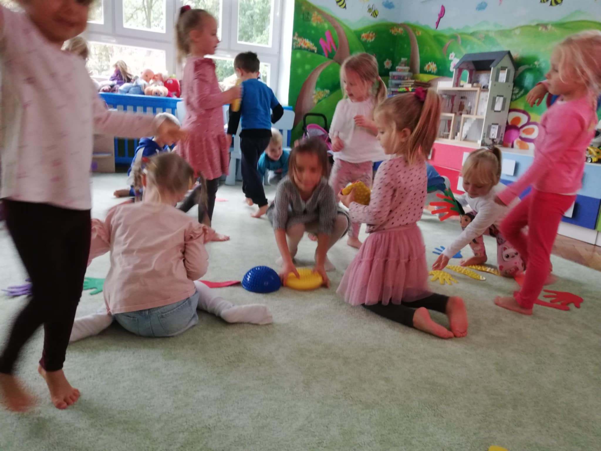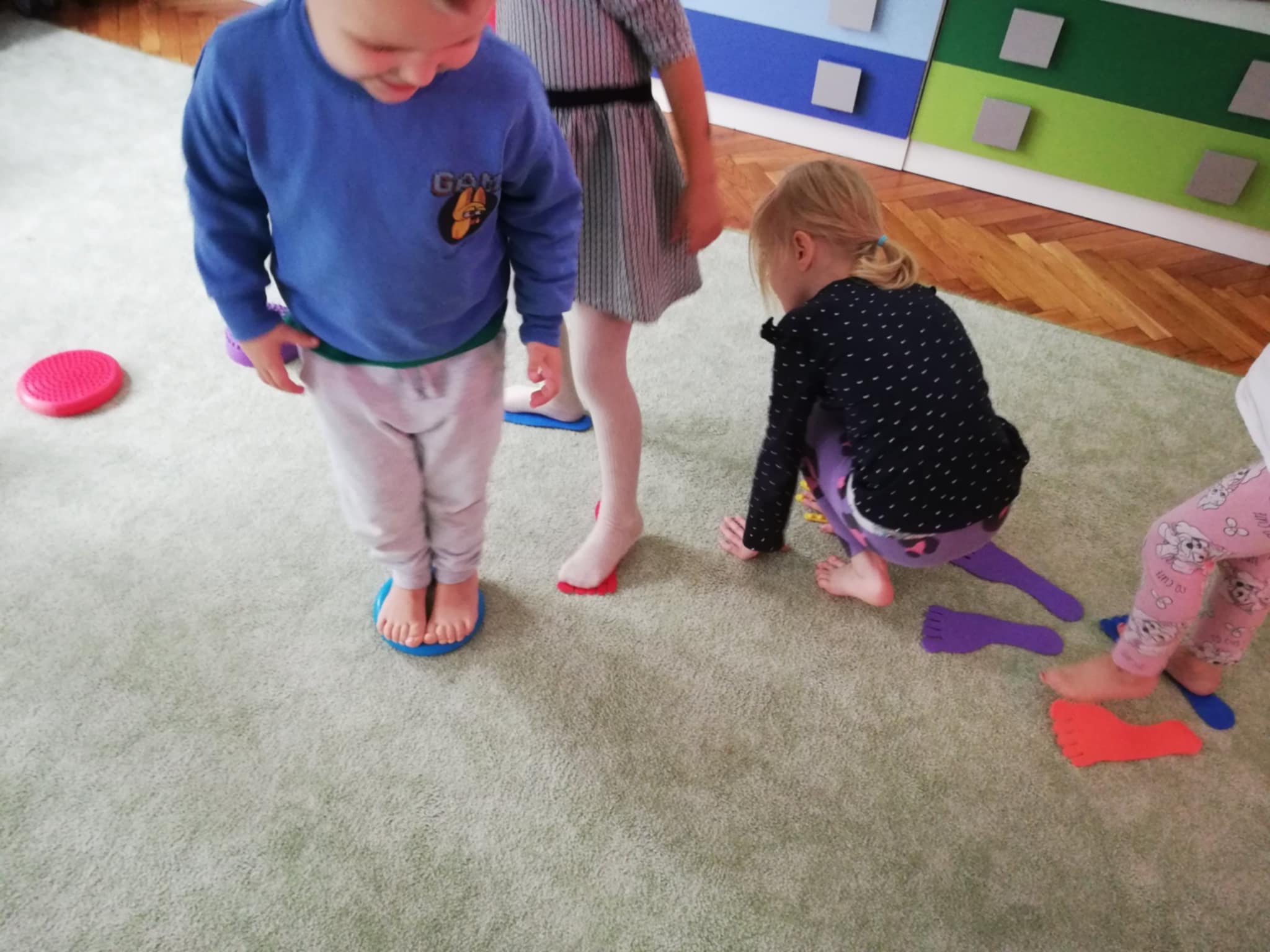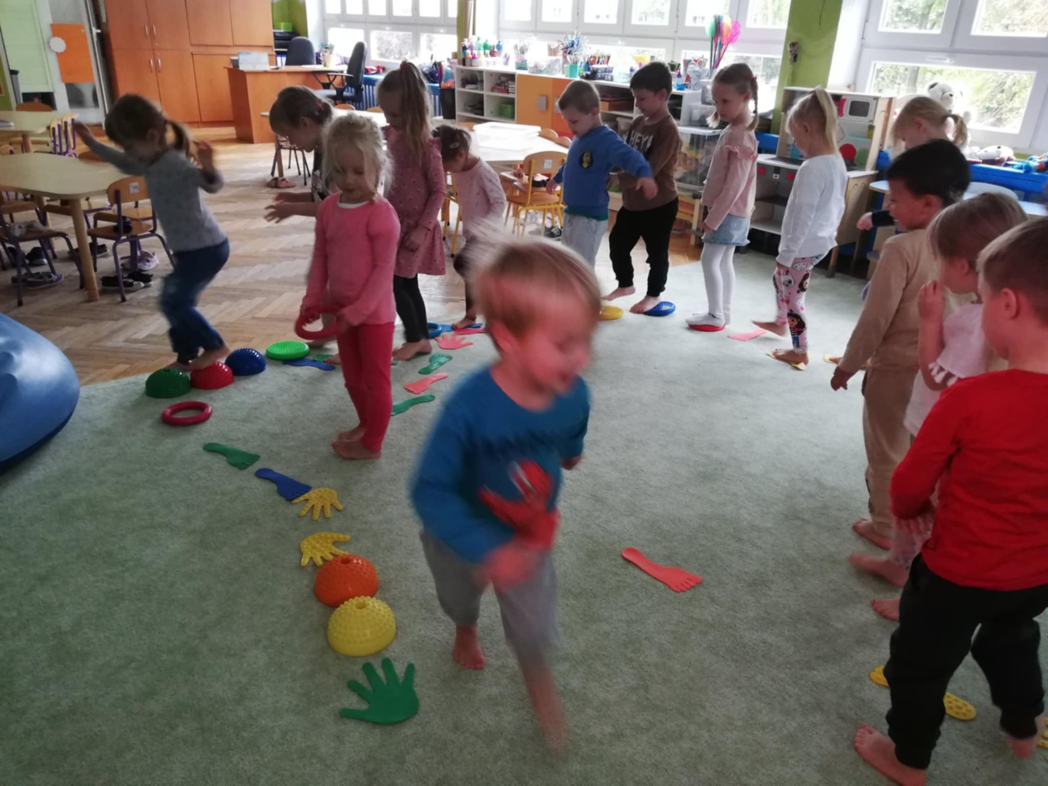 Dzisiaj doświadczaliśmy bosymi stopami. Spacer po krążkach i jeżykach, stópkach i łapkach to jedna z aktywności, która angażowała nasz zmysł dotyku. Przy okazji mieliśmy okazję sprawdzić, kto musi jeszcze poćwiczyć samodzielne zakładanie skarpet.