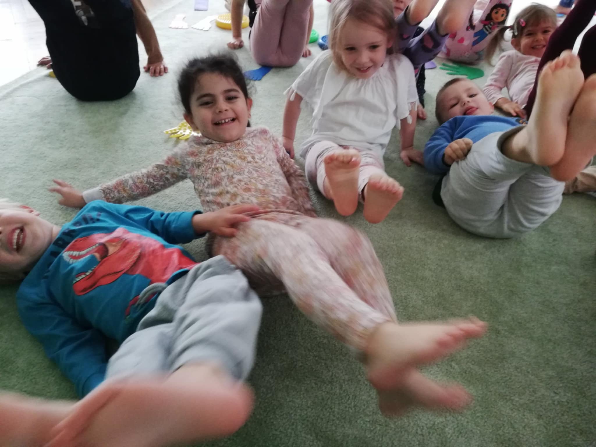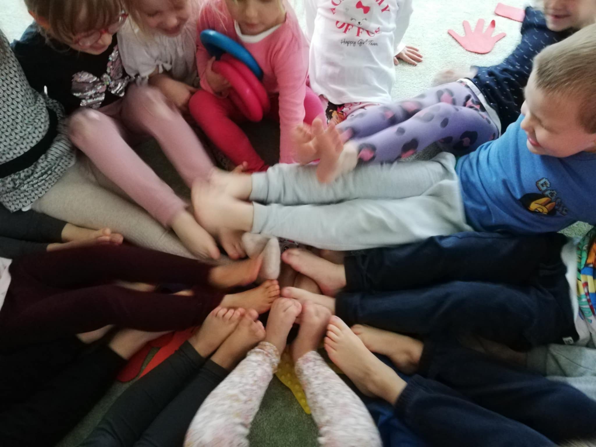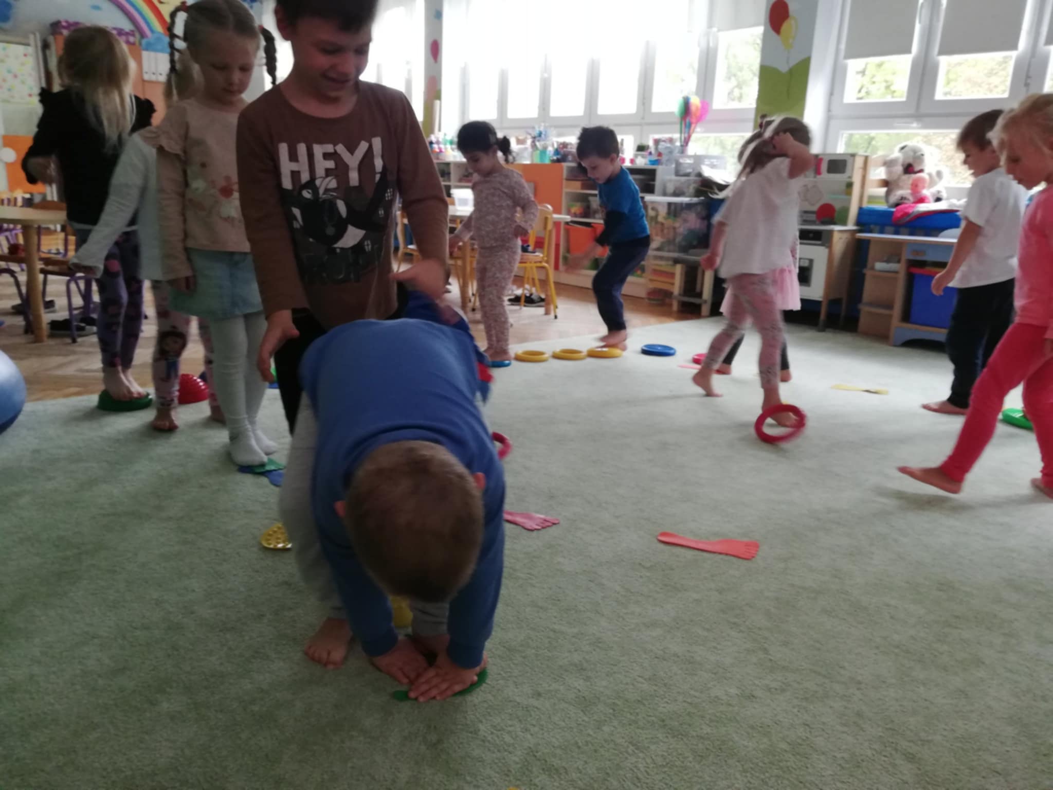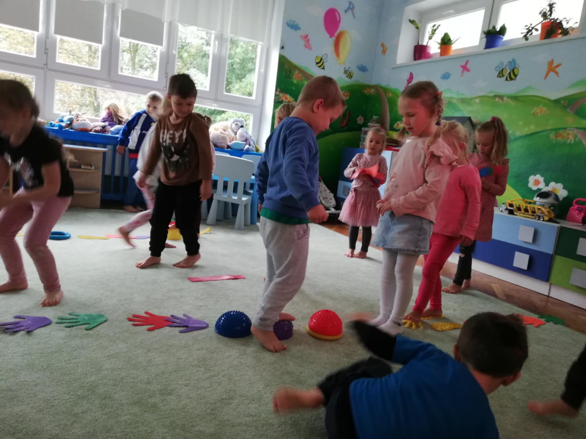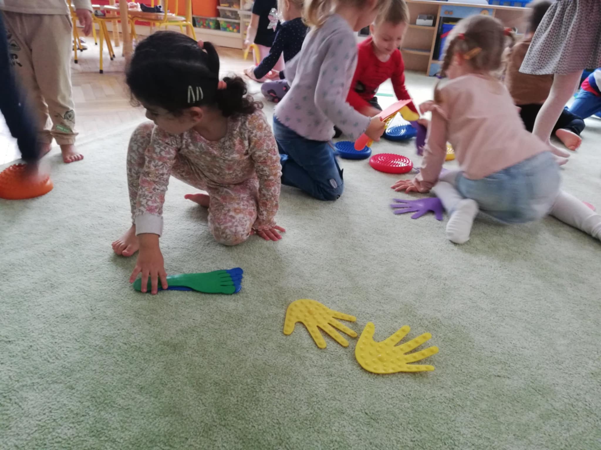 Dzisiaj doświadczaliśmy bosymi stopami. Spacer po krążkach i jeżykach, stópkach i łapkach to jedna z aktywności, która angażowała nasz zmysł dotyku. Przy okazji mieliśmy okazję sprawdzić, kto musi jeszcze poćwiczyć samodzielne zakładanie skarpet.