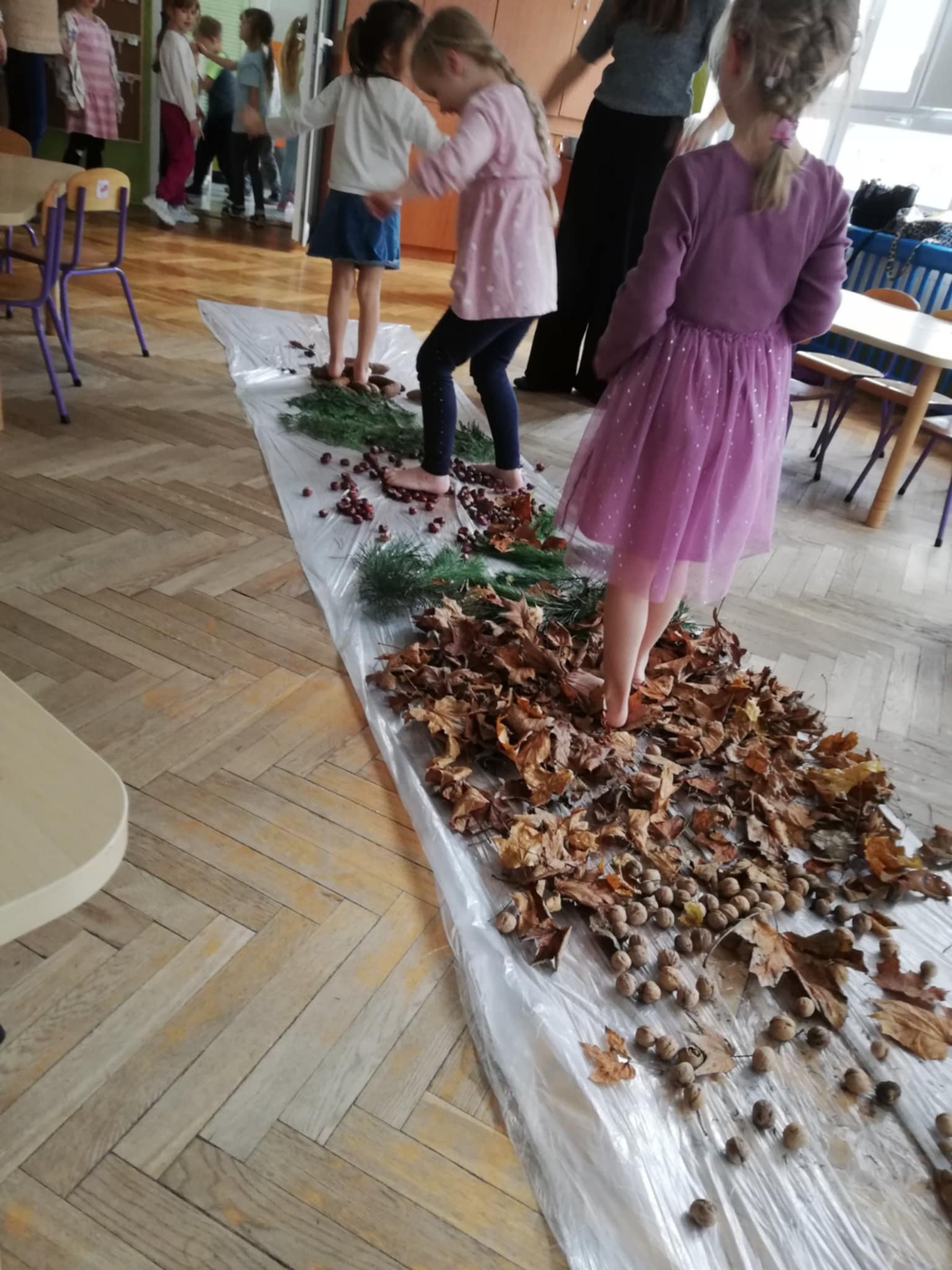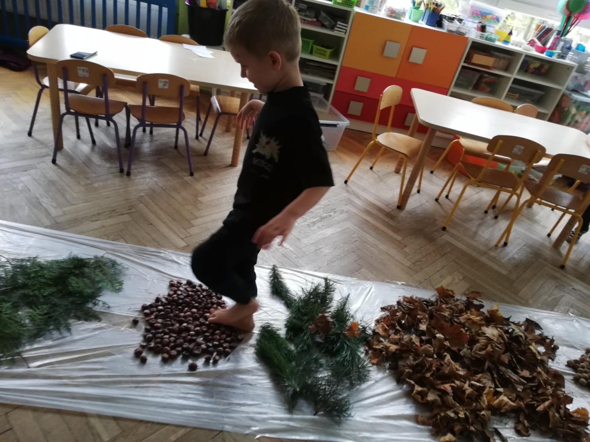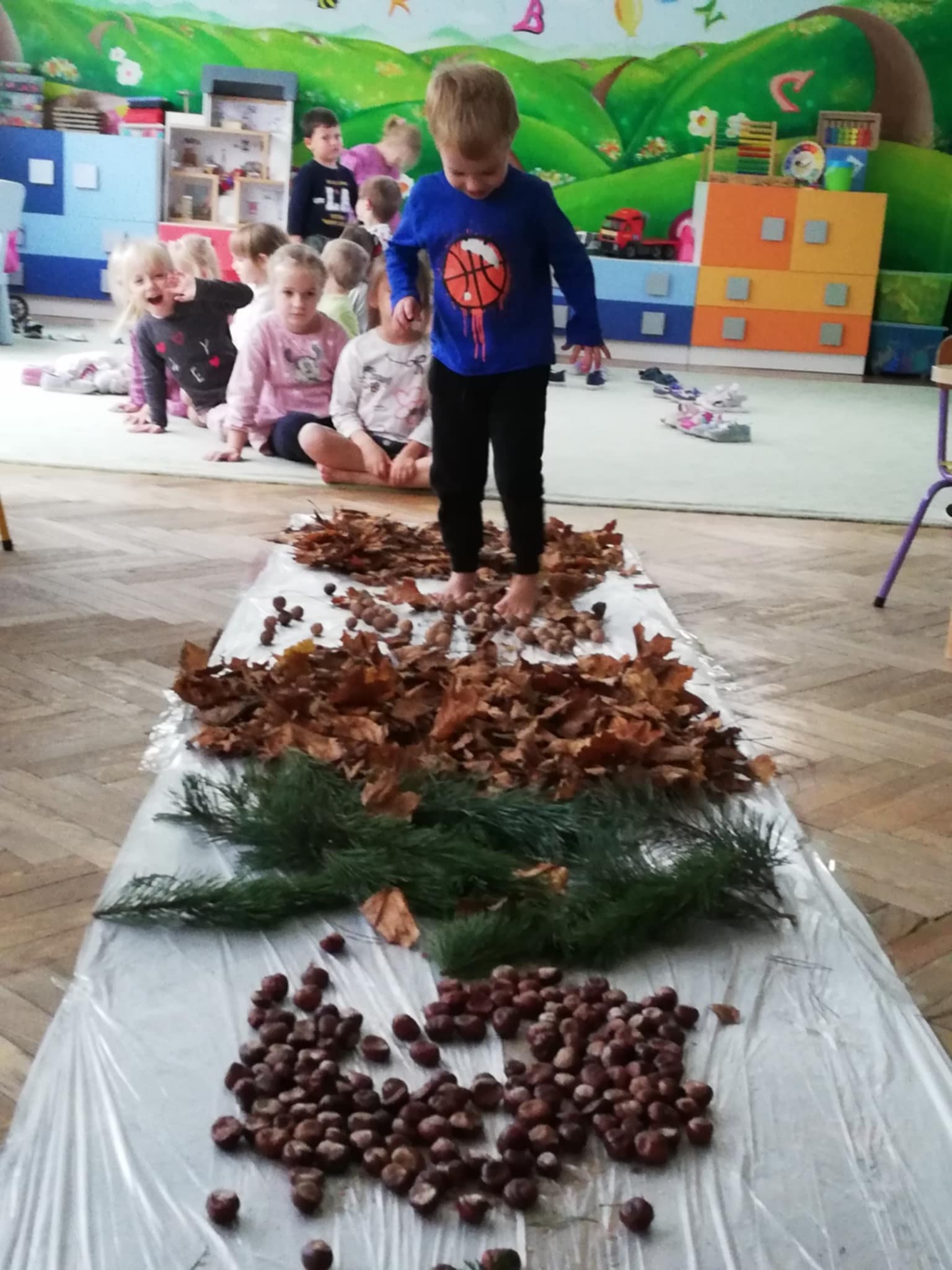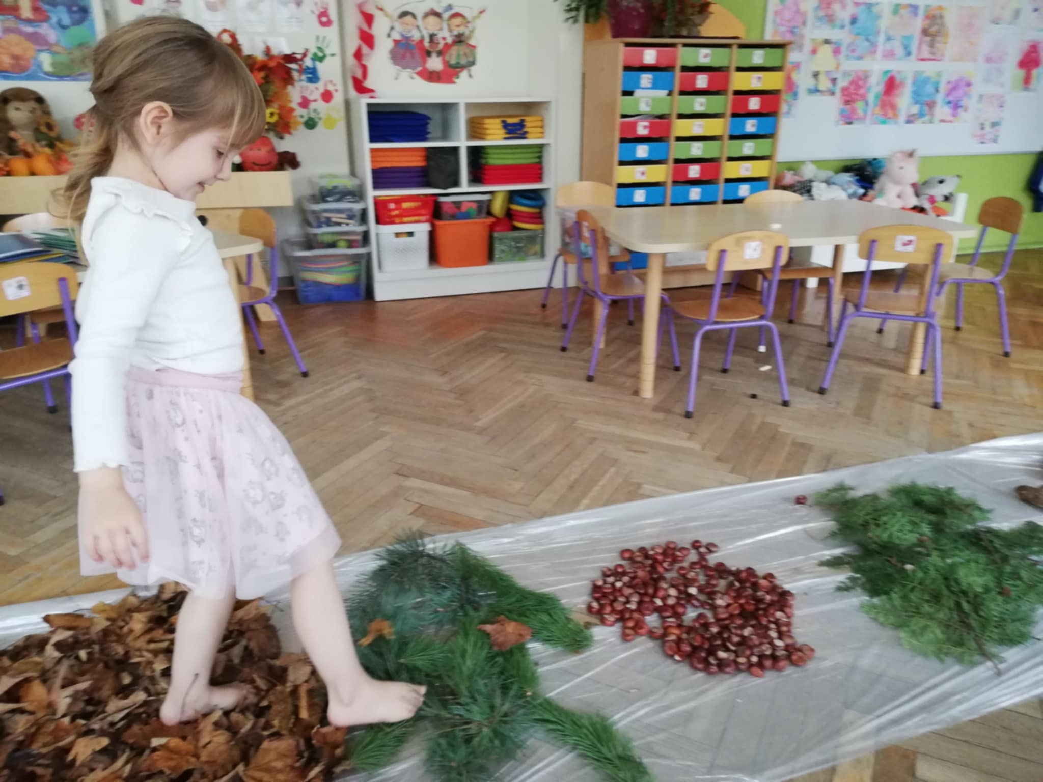 Uwielbiamy chodzić boso, więc Pani wychodząc naprzeciw naszym potrzebom zorganizowała w sali jesienną ścieżkę sensoryczną. Spacerowaliśmy po liściach, kasztanach, szyszkach, orzechach po gałązkach iglaków. Doznania super. Wszystkim bardzo się podobało:)