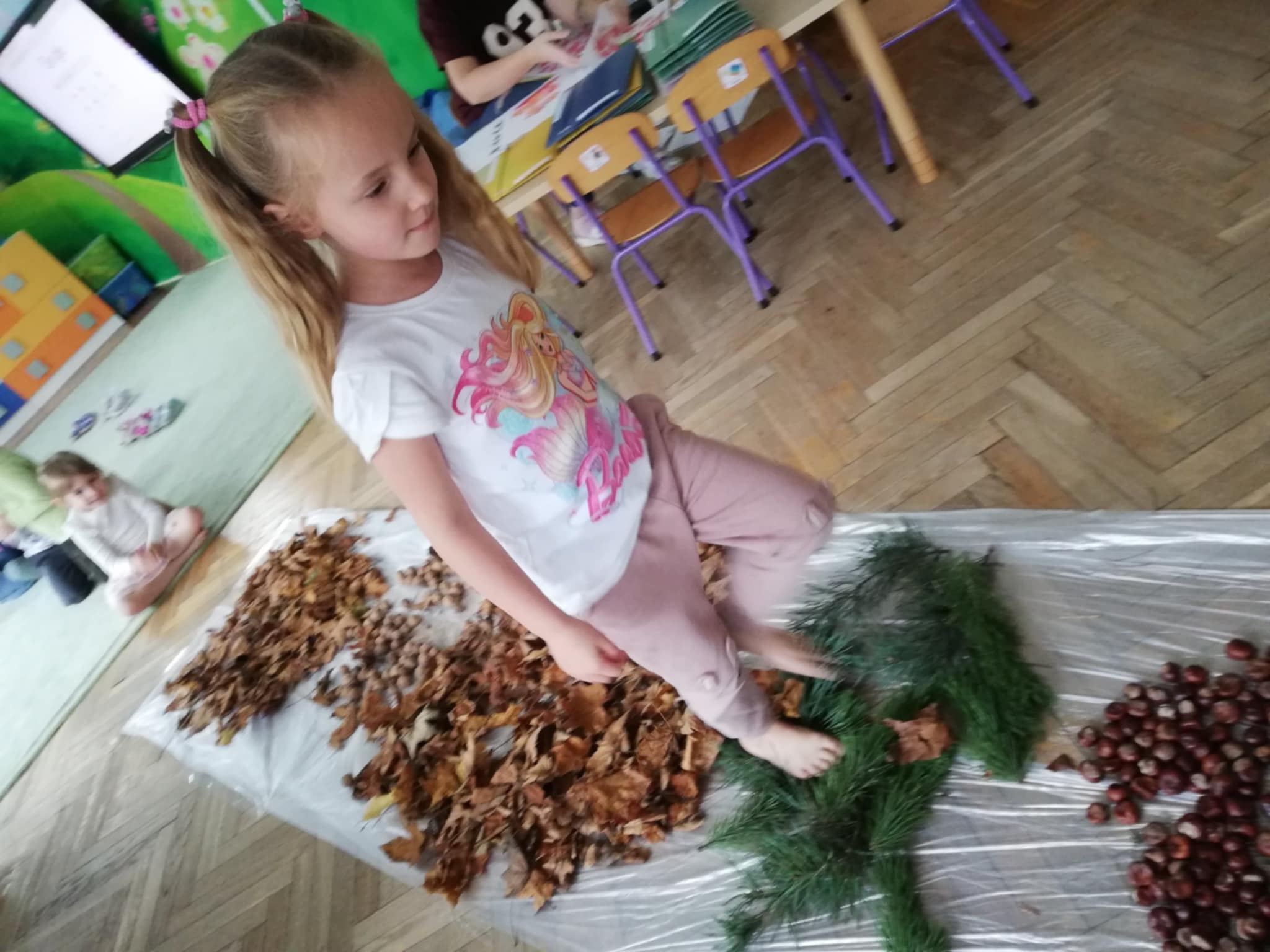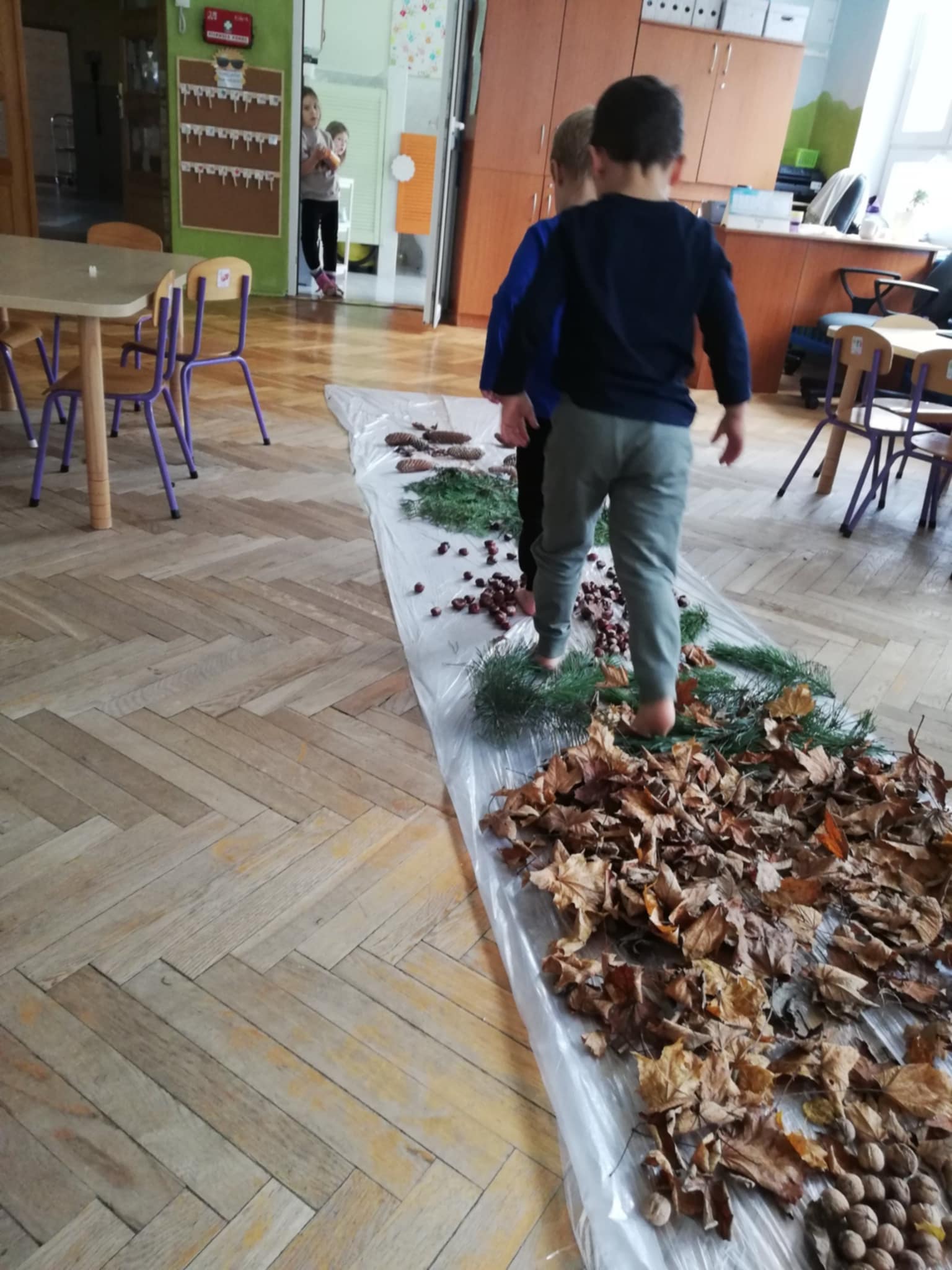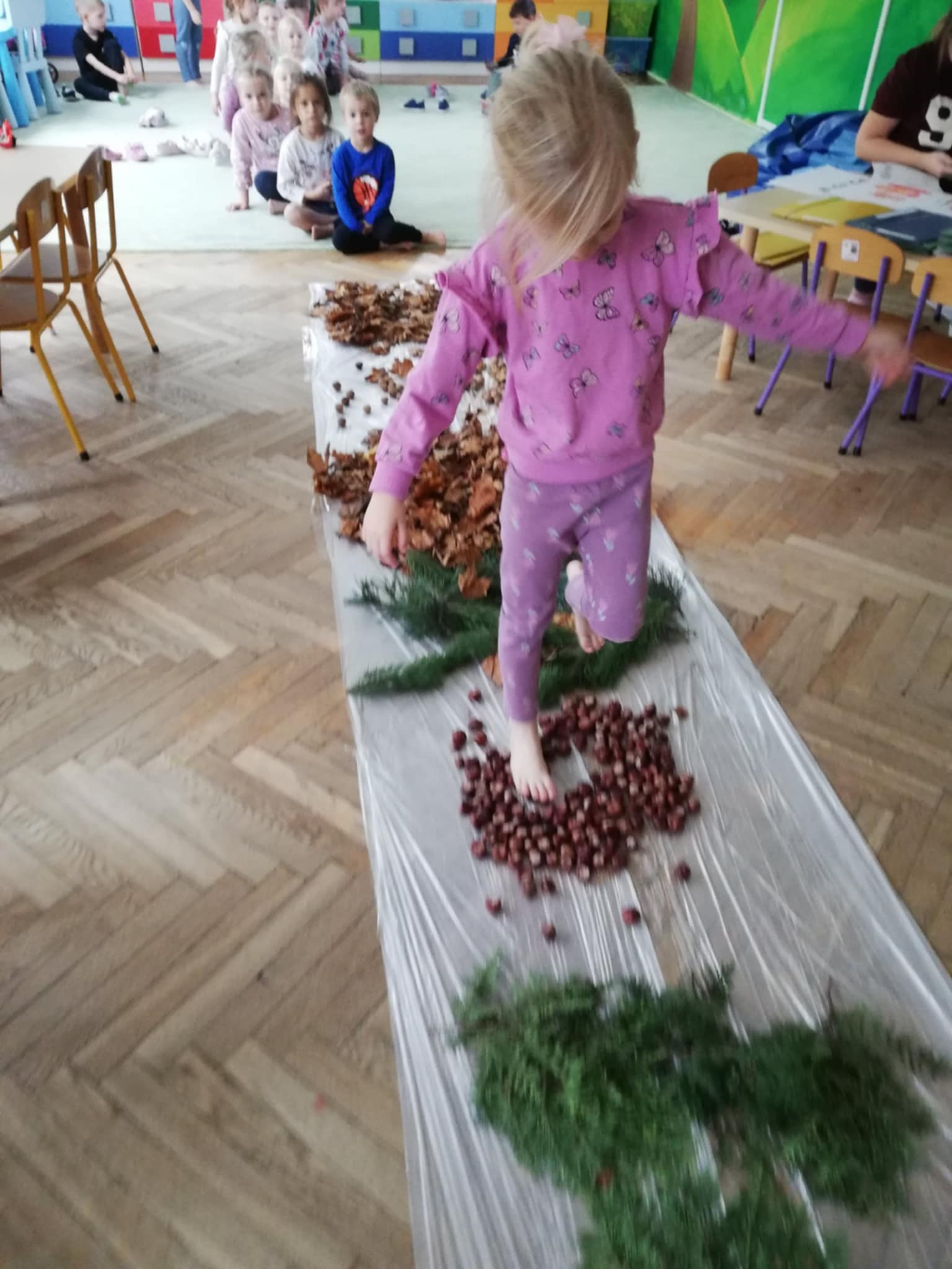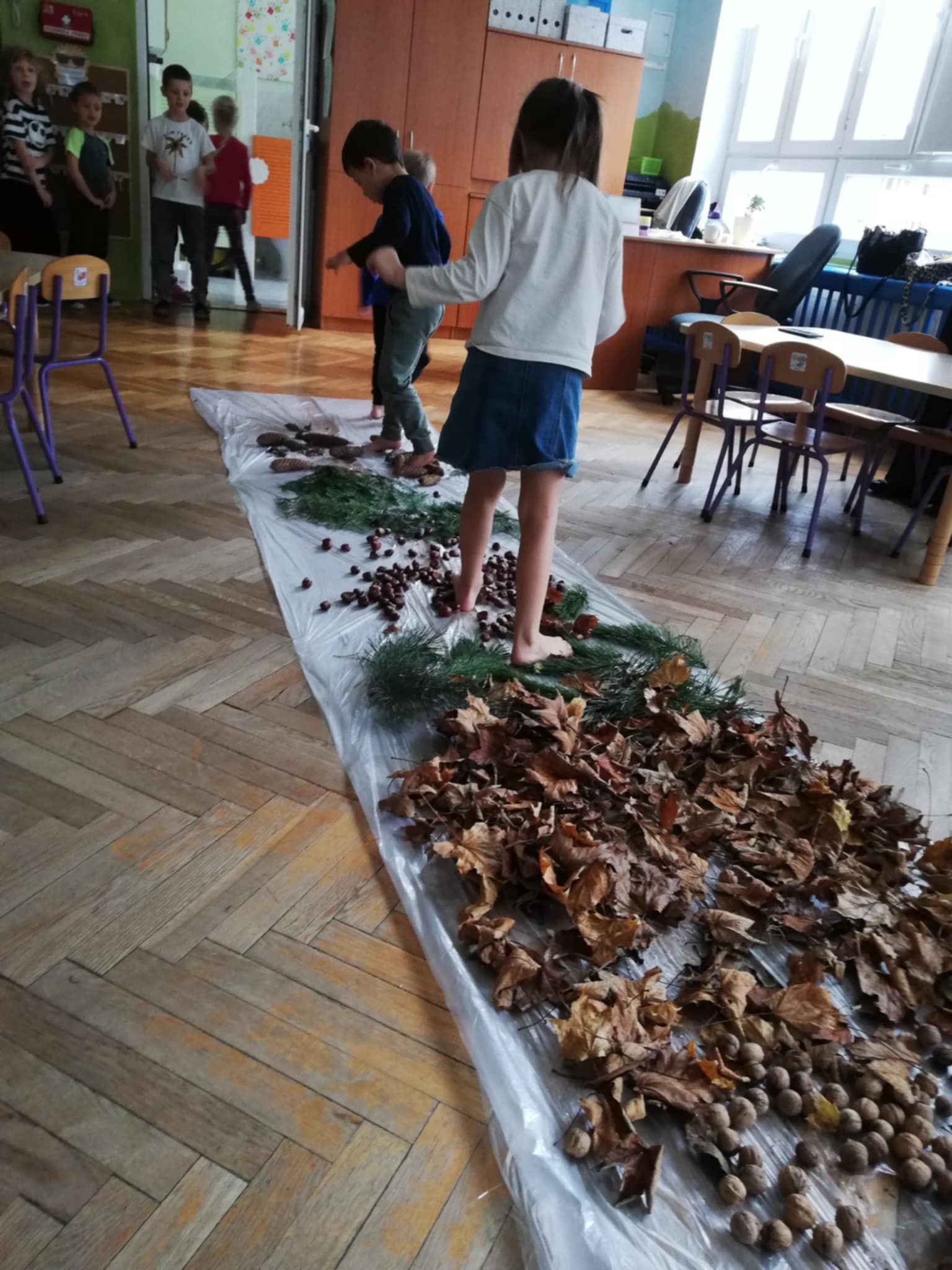 Uwielbiamy chodzić boso, więc Pani wychodząc naprzeciw naszym potrzebom zorganizowała w sali jesienną ścieżkę sensoryczną. Spacerowaliśmy po liściach, kasztanach, szyszkach, orzechach po gałązkach iglaków. Doznania super. Wszystkim bardzo się podobało:)