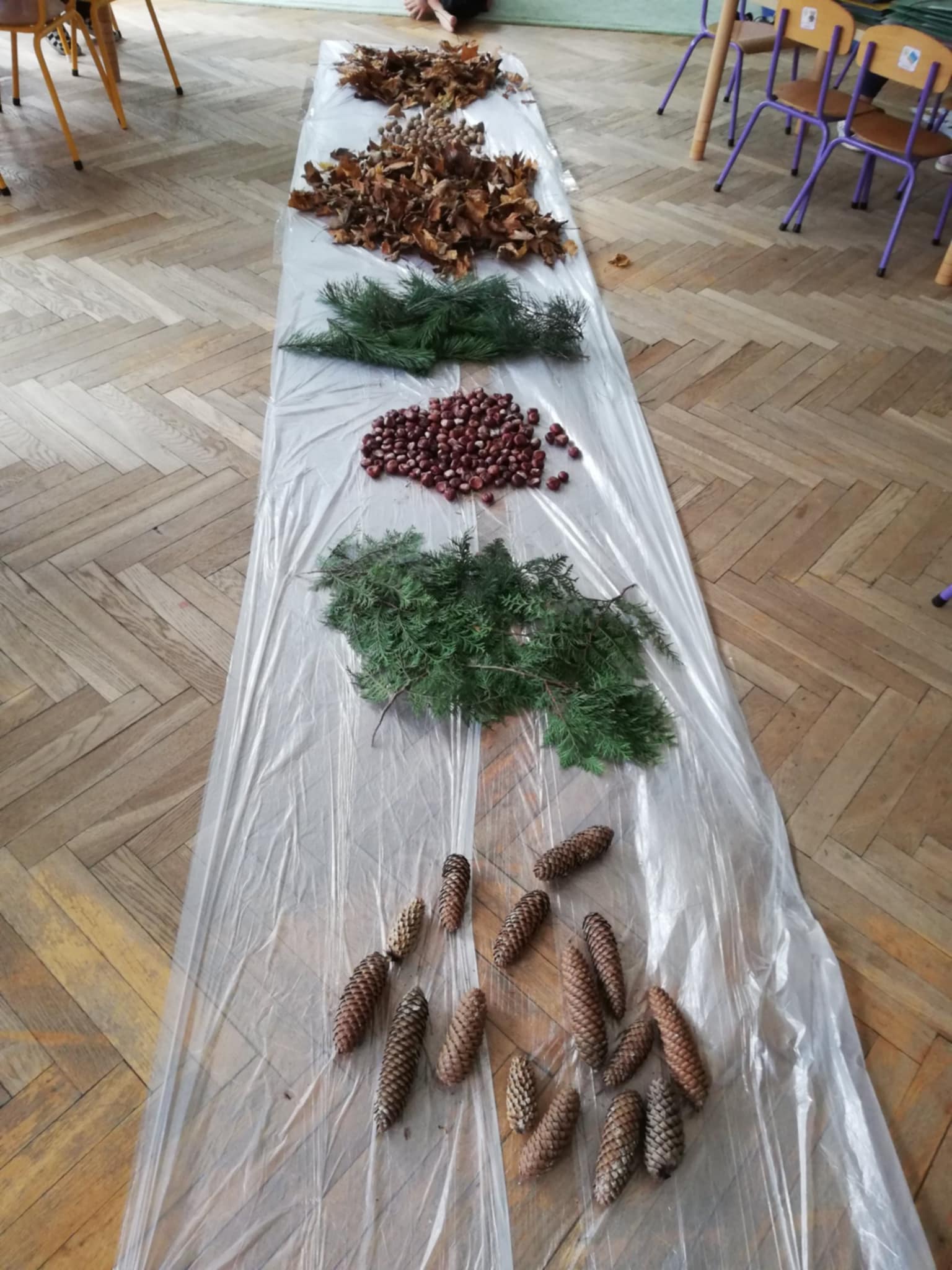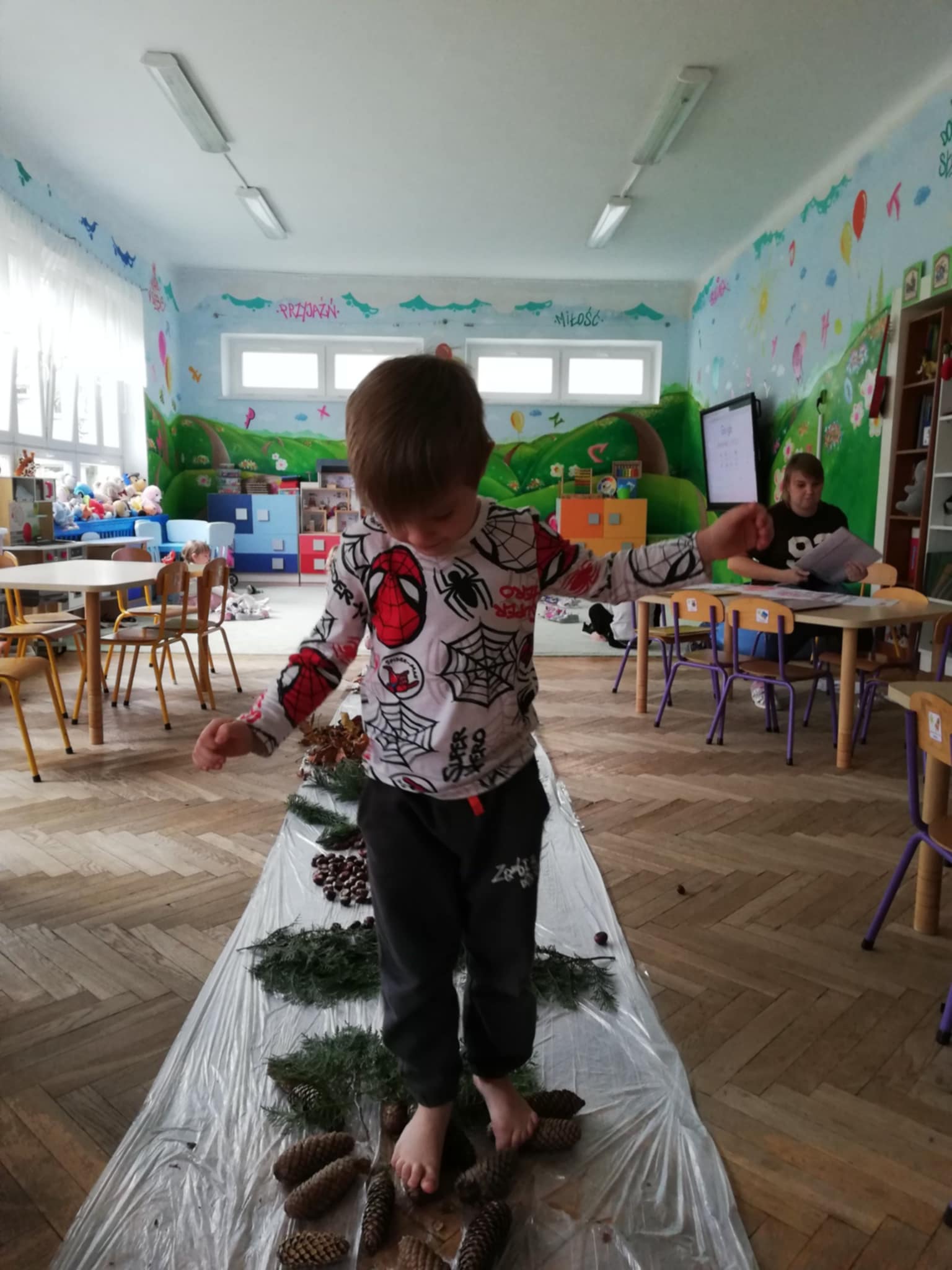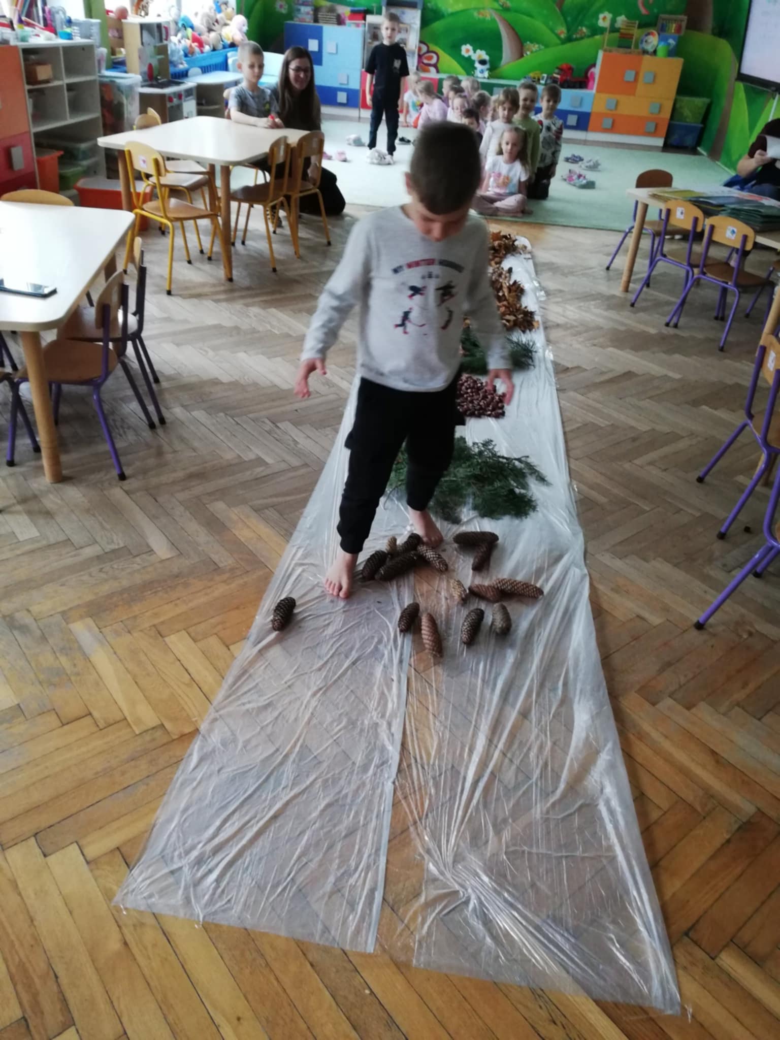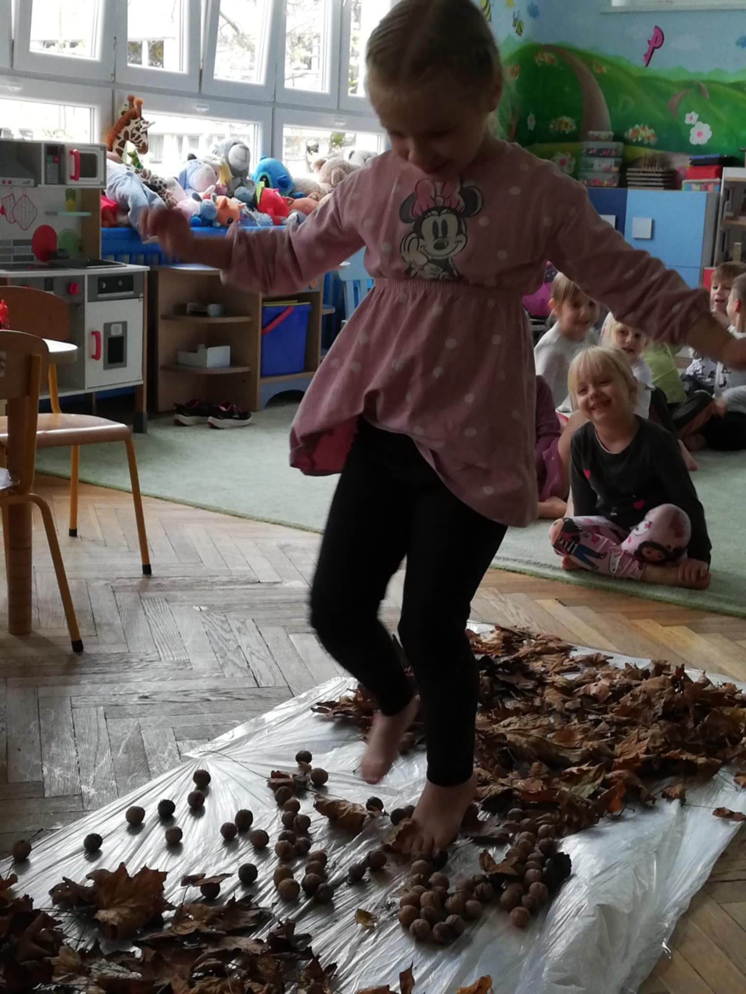 Uwielbiamy chodzić boso, więc Pani wychodząc naprzeciw naszym potrzebom zorganizowała w sali jesienną ścieżkę sensoryczną. Spacerowaliśmy po liściach, kasztanach, szyszkach, orzechach po gałązkach iglaków. Doznania super. Wszystkim bardzo się podobało:)